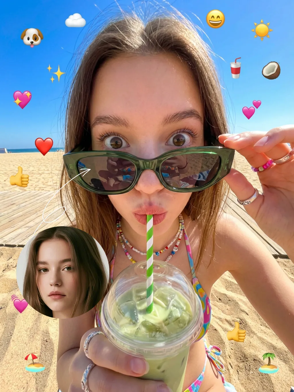 The figure from the uploaded image (unchanged facial features, age and gender, with natural facial retouching and a fresh sheer makeup look). An extreme close-up selfie shot from a first-person perspective, the figure stands close to the camera, captured with an iPhone 14 in a casual street photography style. The figure’s eyes are wide open, lips pouted and eyes round in an exaggerated wide stare, with vivid and playful facial expressions; they look straight at the camera, sipping a drink through a green-and-white striped straw. They are wearing a cute colorful bikini, accessorized with colorful Y2K-style jewelry and oversized dark green sunglasses – the sunglasses slip down to the tip of the nose, revealing the eyes, with the surrounding scenery reflected on the lenses. The figure holds a clear plastic cup filled with light green iced drink and ice cubes. The scene is bathed in bright outdoor sunlight, in clear daylight with soft shadows and vibrant natural light. Color palette: bright green, deep blue, light green, warm brown (wooden boardwalk), bright blue (sky). Background: beach, seaside sand, a sun-drenched boardwalk, with a vibrant and casual seaside vibe. The overall style features a dopamine color scheme, Y2K accessories and a distinct Y2K aesthetic. Adorable iPhone emoji-style stickers are randomly scattered around the figure and across the entire frame as decorations (🐶、☁️、✨、😄、☀️、🥥、🥤、💗、❤️、👍、🐶、🏖️、🏝️). The shot uses an ultra-wide-angle lens with extreme perspective, making the figure’s head appear oversized.