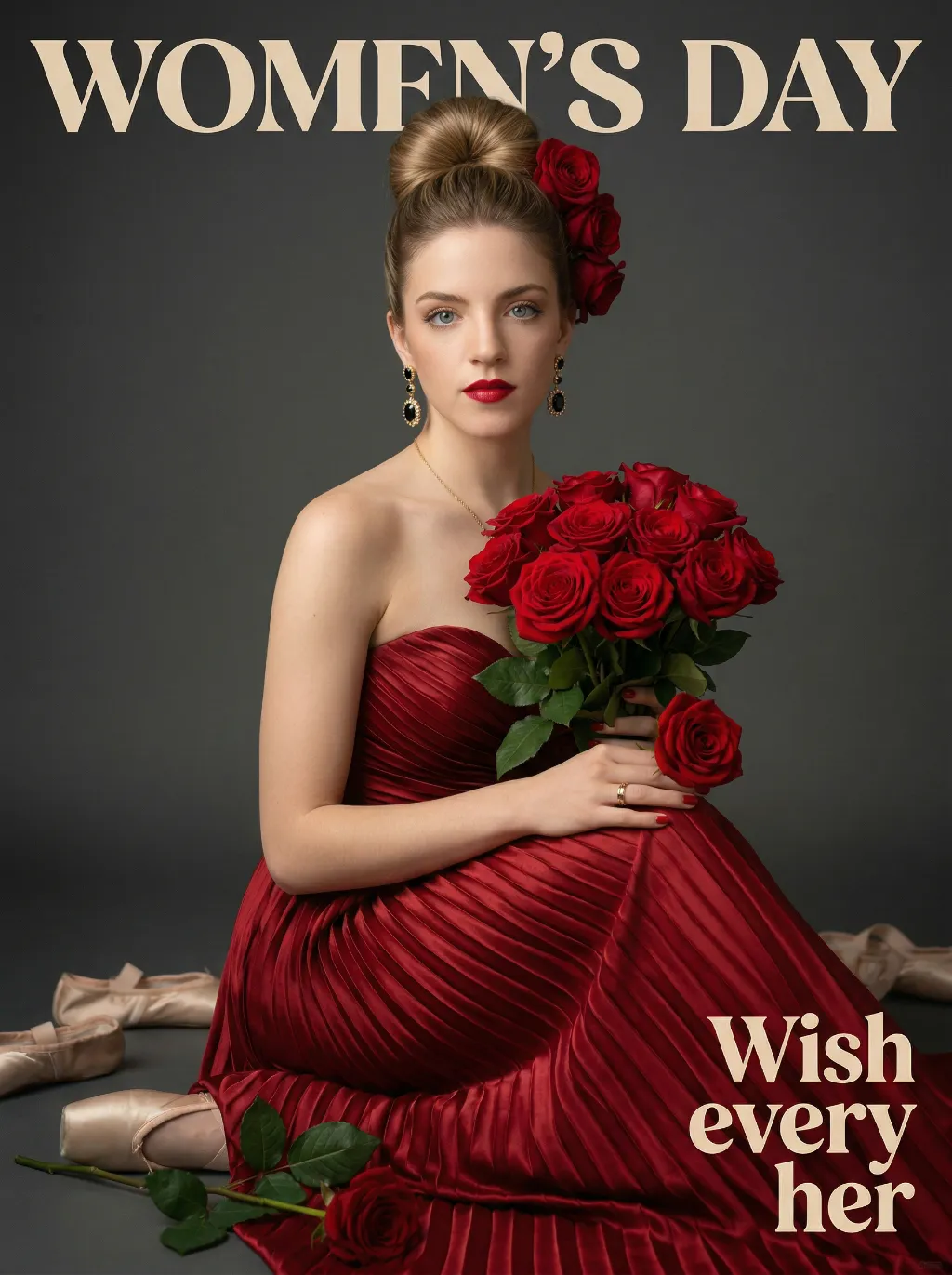 Use the exact same facial features, gender, and age as the uploaded image.Hyper-realistic half-body portrait photography, cinematic lighting, 8K resolution, shallow depth of field, rich and warm color palette. her hair styled in an elegant high bun with a few red roses tucked into the side of her hair. She wears dangling gold earrings with black gemstones, a thin gold necklace, and a gold ring on her right hand. Her makeup is sophisticated, featuring bold red lipstick and defined eyes. She is dressed in a strapless, floor-length gown made of deep red pleated satin fabric, the texture of the folds is extremely detailed. She holds a lush bouquet of fully bloomed red roses with green leaves in her arms, one rose resting gently on her right hand. She sits gracefully, looking directly at the camera with a calm and alluring expression. The background is a smooth, matte dark gray studio backdrop. On the dark floor around her, there are scattered ballet pointe shoes and a single fallen rose with green leaves. The overall style is vintage and luxurious, with soft directional lighting highlighting the sheen of the satin and the velvety texture of the rose petals, creating a strong sense of drama and elegance..The text "WOMEN'S DAY" is displayed at the top in large, bold, stylized artistic font.The text "Wish every her" is positioned in the lower right corner in a complementary artistic font.