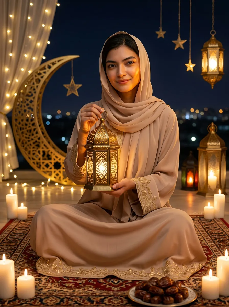 Maintain the exact same facial features, gender, and age as the person in the uploaded image. A woman wearing a soft beige abaya with delicate gold embroidery on cuffs and hem, paired with a matching beige headscarf. She sits cross-legged on an ornate traditional Persian rug, holding a glowing ornate brass lantern with intricate lattice patterns in both hands, smiling gently at the camera. High contrast lighting, dramatic chiaroscuro, deep soft shadows on one side of the face, warm golden highlights on the other side, backlight creating a soft halo around hair and headscarf. Surrounding elements: lit white candles placed around the rug, a golden plate filled with plump dates in the foreground, a large decorative golden crescent moon with fairy lights, hanging star ornaments and glowing Arabic lanterns in the background, distant blurred city lights under a dark night sky. Cinematic warm lighting, photorealistic portrait, 8K, high detail, cozy and serene Ramadan/Eid atmosphere.