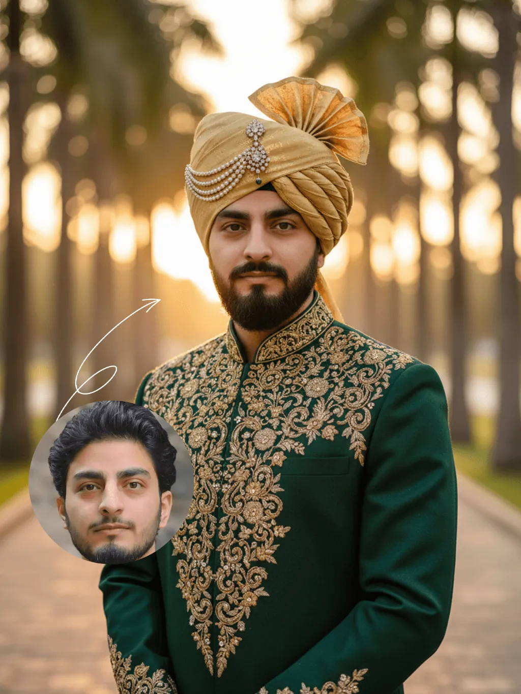 Strictly preserve the identity of the uploaded portrait (retain facial contours, native Indian skin tone, hairstyle, and age). A half-body hyper-realistic cinematic portrait of a handsome South Asian groom with a well-groomed thick black beard and a deep, confident gaze. He is dressed in a luxurious dark emerald green traditional Sherwani, with the front placket and shoulders adorned with intricate and elaborate hand-embroidered golden floral and scroll patterns, paired with a matching opulent gold turban embellished with full diamonds. The scene is set in a palm tree alley during golden hour sunset, with warm backlighting creating dreamy lens flares and a soft bokeh effect, and the background is blurred to highlight the subject. The overall atmosphere is luxurious, noble, and romantic, dominated by rich gold and emerald green tones. The image features ultra-high-definition details, 8K resolution, professional photography quality, and rich, delicate layers of light and shadow