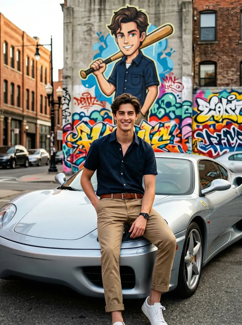 Maintain the exact same facial features, gender, and age as the person in the uploaded image. Photorealistic photo of a handsome young man with neatly styled brown hair, smiling brightly at the camera. He wears a dark navy short-sleeve button-up shirt, khaki casual pants with rolled cuffs, a brown leather belt, and white sneakers, with a black watch on his left wrist. He sits casually on the hood of a stylish silver Ferrari sports car parked on an urban street, one hand in his pocket and the other resting on his knee. Behind him is a large, vibrant graffiti mural on a concrete building wall, depicting a cartoon version of himself in the same outfit, holding a wooden baseball bat over his shoulder, surrounded by colorful street art tags and patterns. Background: urban street scene with brick buildings, street lamps, and distant cars, natural daylight, soft warm lighting, shallow depth of field. No logos, watermarks, or text overlays in the image. Cinematic composition, 8K resolution, shot with a Sony A7R V camera and 50mm f/1.8 lens, hyper-detailed textures, sharp focus on the man and the car, capturing a playful and stylish atmosphere that matches the mural behind him.