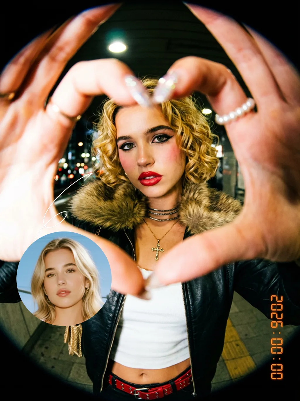 The uploaded figure (with unchanged facial features) forms a heart shape with both hands in front of the lens for a framed composition, featuring a shallow depth of field (the large, tilted hands in the foreground are slightly blurred). This is a portrait photoshoot in the ppgalclub style, with Japanese Shibuya Y2K fashion styling. Captured in a fisheye lens close-up (strong fisheye distortion with slight stretching at the frame edges) from a slightly low-angle perspective, the figure is centered to fill the entire frame. The figure has short, curly golden bob hair and bold makeup (thick black eyeliner + plump red lips + translucent pink-toned blush), leaning forward with the face facing the camera directly. The outfit includes a black leather vest with a fur collar, a white camisole, a red stud-embellished belt (with a cropped waist design), a golden cross necklace paired with multi-layered metal chokers, sequin-embellished nail art, pearl-encircled rings, and a small golden chain bag. The scene is set in a Shibuya underground passage at night, with dim artificial lighting and a high-intensity flash fired directly at the figure (creating stark light and shadow contrast, prominent highlights on the figure’s face, and a dark-toned background), plus blurred bokeh light spots in the background. The image features film grain texture, a highly saturated black/gold/red color scheme, and ultra-high-definition details; a black fisheye lens vignetting frames the entire image, and an orange vertical digital date watermark (2026:00:00) is added to the bottom right corner.