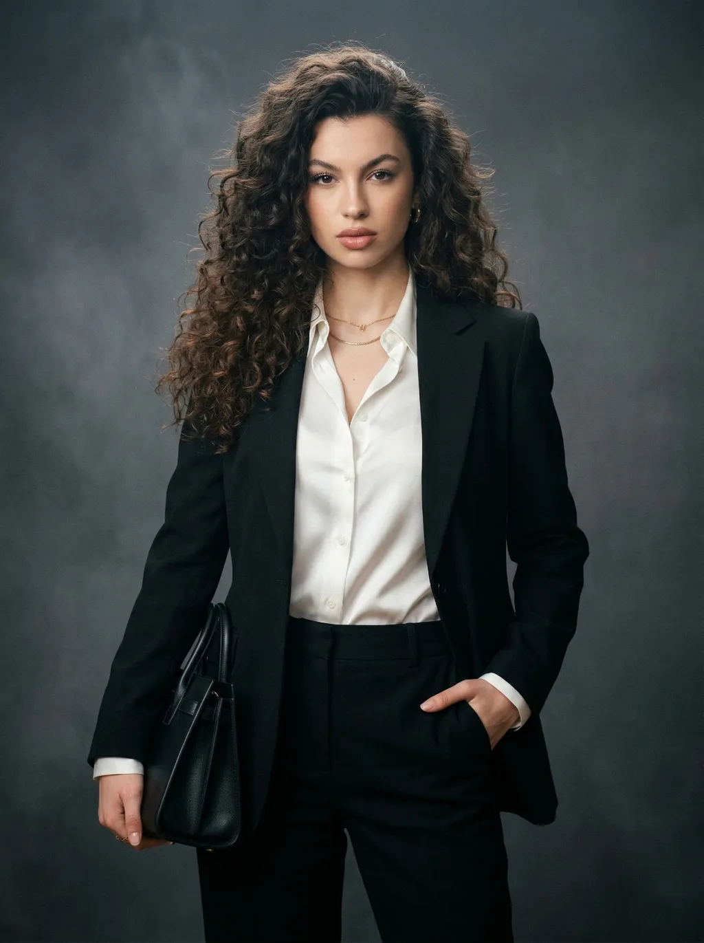 Extreme close-up portrait,Head and shoulders close-up portrait (shot precisely to the chest): Shot by professional fashion editors and photographers, with an upscale and luxurious style. The person in the uploaded picture (with their facial features, gender, hairstyle and age remaining unchanged), has a refined makeup, elegant and generous accessories, is smiling naturally, wearing a well-tailored dark black luxurious suit (a fashionable and avant-garde professional workwear style), a pure white silk shirt, one hand in the pocket, with a confident and sharp expression, a dignified and powerful posture. This photo is a product of the Japanese high-end photography style, using soft diffused film-like lighting, delicate contour lighting, transparent and hazy dark gray studio background, low-key and exquisite color palette, ultra-fine skin texture (using Japanese-style clear photo editing processing), clear and prominent facial features and suit fabric, 8K ultra-high-definition quality, professional fashion photography, elegant and powerful aura, simple high-end aesthetics, subtle 35mm film grain.