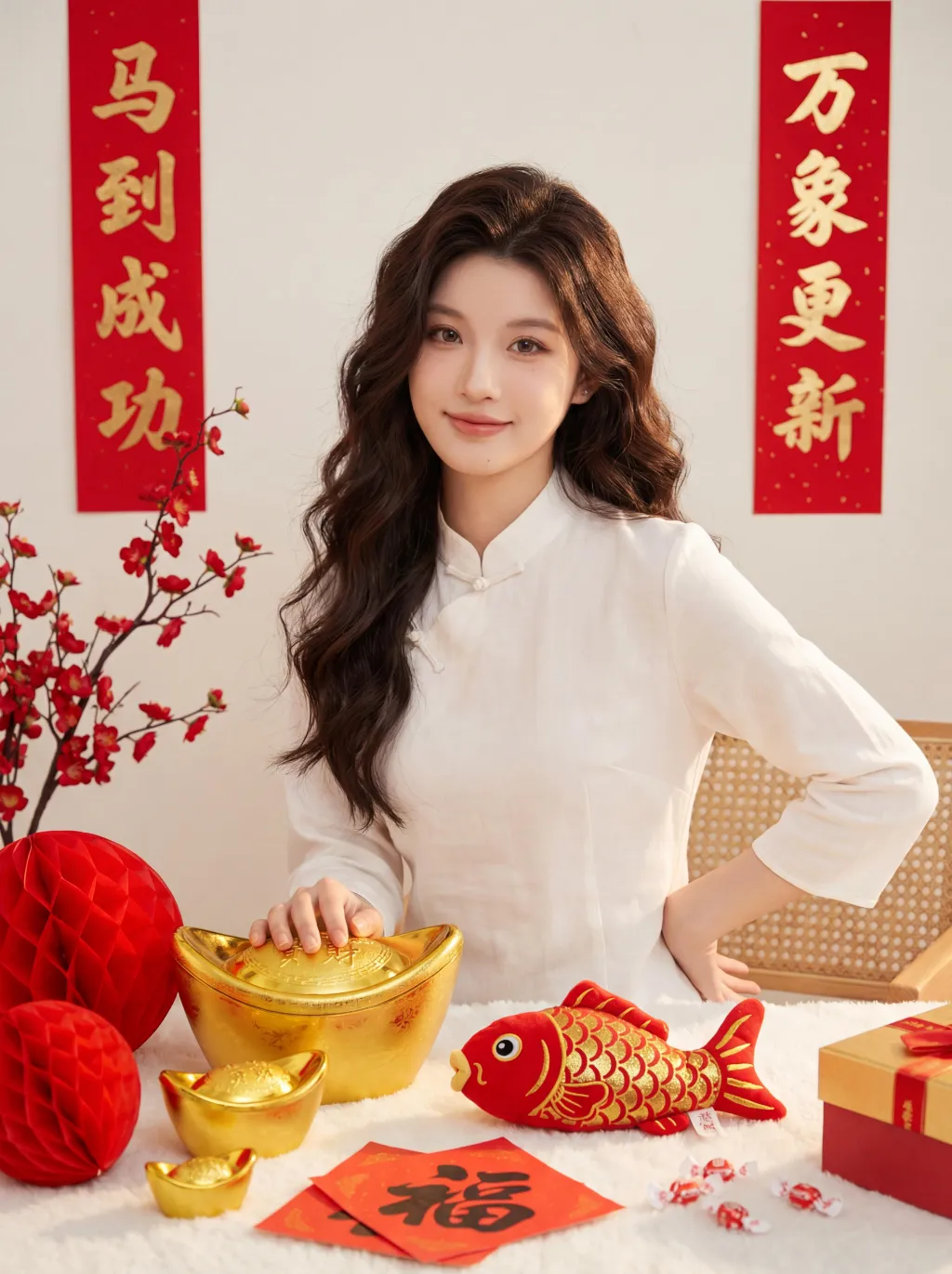 100% facial feature lock, zero deviation uploaded portrait (contours, eyes, lips, skin tone, youthful look), no facial distortion/over-smoothing, young East Asian sweet girl, standing half-body shot, 45° angle to camera, shoulders relaxed lowered, right hand gently resting on golden ingot ornament on table, left hand naturally at waist, head turned to camera, gentle smile, soft eyes, elegant graceful posture, born-perfect base makeup, brownish-black wild eyebrows, earth-tone eye makeup, teardrop pearlescent under-eye highlights, sunflower curled long lashes, peach blush, mirror-finish reddish-brown lip glaze, cupid's bow highlighter, clean light texture, voluminous dark brown soft layered loose waves, no hair accessories, white new Chinese-style top, cotton-linen blend, stand collar with delicate frog buttons, slim-fit neat version, white fluffy tablecloth, red honeycomb-pattern Fu character balls, glossy golden ingots, red fish plush toy (gold scales, red unicorn horn), red paper with handwritten Fu characters, red-white candies, red-gold gift box corner, traditional Chinese New Year scene, off-white matte wall, red gilded vertical couplets, left couplet: 马到成功, right couplet: 万象更新, positions fixed, no character changes/blurred text, red plum blossom branch, light brown rattan chair edge, clean uncluttered background, warm soft side-front natural light, subtle shadow contrast, enhance clothing & couplet 3D texture, no harsh shadows, red-gold-off-white color palette, festive warm healing vibe, Year of the Horse charm, 8K ultra HD, photorealistic, ultra-detailed, cinematic film grain, HDR, color accuracy 100%, noise-free, clear transparent 负向提示词: no sitting pose, no burgundy sweater, no hair bow/clips, no wrong couplet characters/positions, no messy background, no stiff posture, no unnatural hand movements
