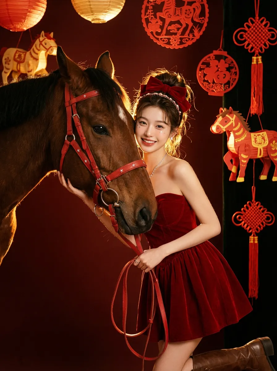 Medium and long shot: The image in the uploaded picture (with unchanged facial features, gender and age, with hair coiled and wearing a red bow and hairband ornaments) is located on the right side of the frame, while the side head of a brown thoroughbred horse is on the left side. This work presents a sweet and dreamy theme characteristic of the Chinese Year of the Horse. The picture has a delicate film texture, with some exquisite and high-end decorations from indoor shooting, a thick festive atmosphere (paper lanterns, red paper cuttings, horse-year lanterns, Chinese knots, etc.) in the background; Color: Using professional indoor lighting, high-contrast warm light illuminates the face of the person and the side head of the horse, the highlighted hair light (contour light) forms a golden halo at the edge of the hair, the color is clean and bright, the horse contrasts strongly with the richly saturated white background, the light contrast is intense, creating a dreamy and warm atmosphere, with a fashionable and avant-garde photography artistic atmosphere; Color: The main color is a low-saturation clean dark red background, the horse, red leather (horses' reins, stars on the dress), low-saturation, high-quality and warm harmonious colors; Shooting angle: Horizontal perspective, the camera is at the same level as the face of the person in the uploaded picture and the side head of the horse, creating a natural and friendly interaction feeling; Character posture: The body slightly tilts towards the camera, holding a red leather strap in hand, the upper body gently leans against the brown horse, the head is close to the horse's face, with a sweet and brilliant smile, looking straight at the camera, the arms are naturally placed in front of the body, the posture is relaxed and intimate; Clothing: A high-end custom-designed red velvet strapless dress, wearing small and exquisite hair ornaments, around the eyes there is a delicate silver star powder makeup, wearing exquisite high-end custom accessories, wearing retro brown leather boots, fashionable and avant-garde, exquisite and elegant; The authenticity, artistry of the film, film-level ultra-high-definition 8K image quality, fashion magazine style, photography pioneer fashion artistic style, top lighting effects.