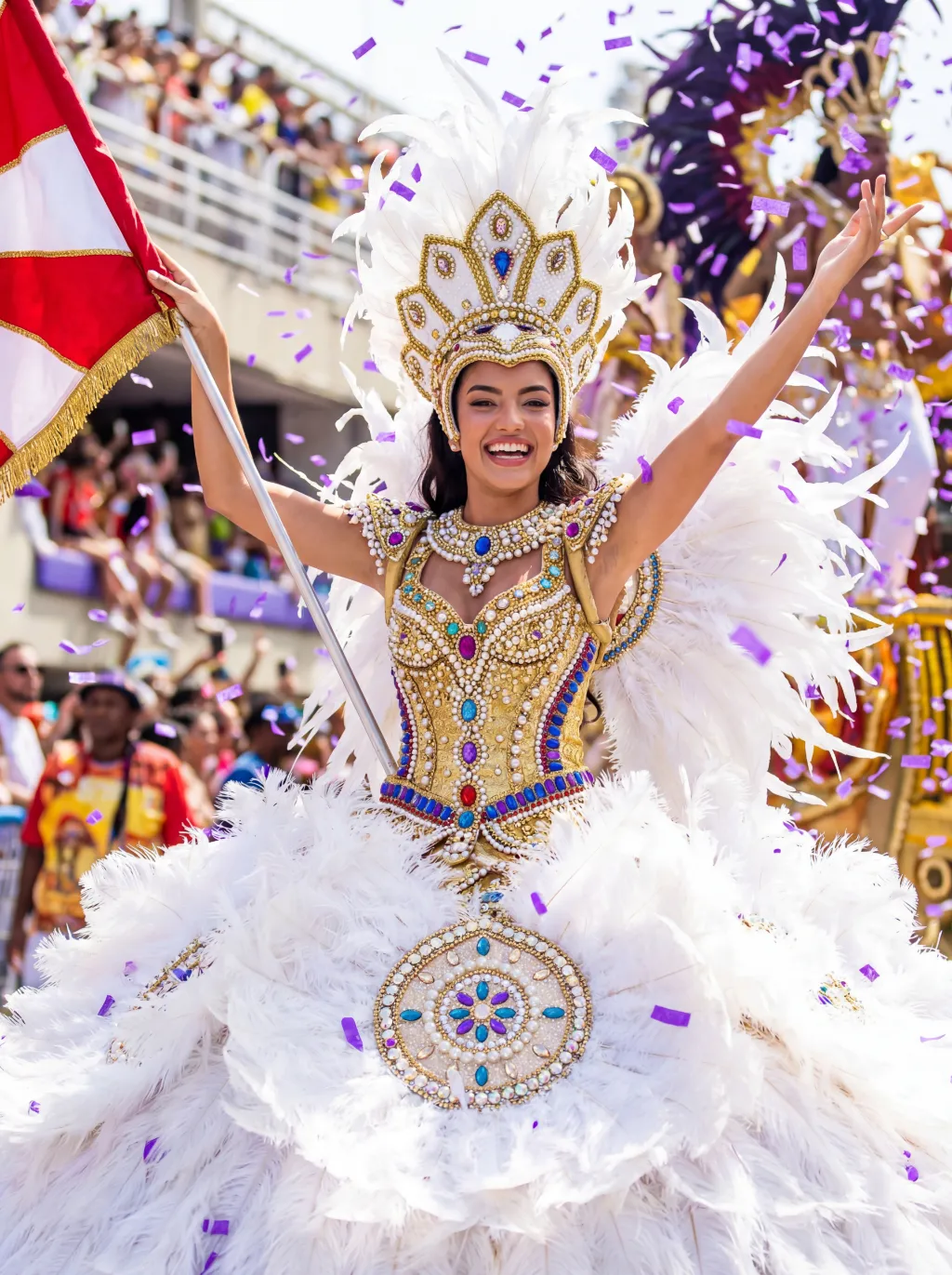 Use the facial features, gender and age of the character in the uploaded picture exactly as they are, reimagined as a stunning Brazilian Carnival queen. A joyful Brazilian Carnival performer stands at the center of a grand, feathered float during the Rio Carnival parade.wears an elaborate, opulent costume: a towering, bejeweled white headdress with gold trim, a golden bodice intricately decorated with pearls, gemstones, and colorful accents, and a massive, voluminous skirt made of layers of pure white feathers, with a circular front panel featuring large, vibrant gem-like decorations in blue, purple, and red. holds a red-and-white flag in one hand, arms raised in celebration, with a wide, ecstatic expression. The scene is filled with swirling purple confetti, set against a bright, festive parade ground. The style is a high-resolution, vibrant photograph with sharp details, rich saturated colors, and a dynamic, celebratory atmosphere.