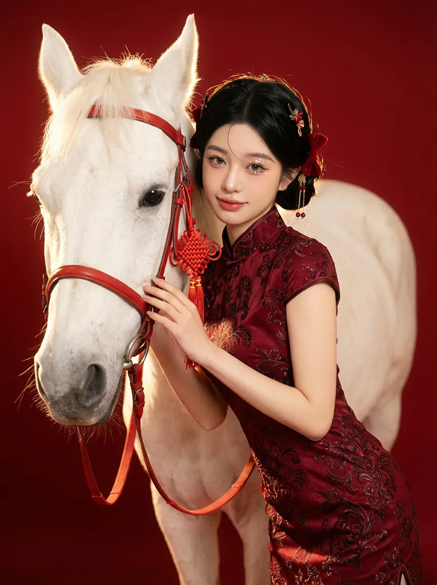 Medium and long-range shots (capturing the upper body of the person and the facial and upper body of the horse): In the uploaded image, the character's image (with unchanged facial features, gender, and age) is wearing a new Chinese-style wine-red high-end tailored tight-fitting cheongsam, featuring exquisite fabric and dark patterned embroidery, with neatly styled black hair (randomly decorated with some Chinese retro hairpins and small red bows), exquisite makeup, eye makeup with glitter powder, wearing exquisite high-end custom accessories, standing sideways next to a pure white steed (with a red leather reins on the horse's head and a new Chinese-style exquisite festive Chinese knot decoration), the character standing sideways leaning against the horse, arms draped over the horse, head looking at the camera, with a lazy and cold expression, looking forward with a gentle smile, in an indoor photography studio, the deep red background is very prominent, illuminated by professional indoor lighting, with high-contrast warm light sources, highlighting the face of the person and the horse, the hair light (contour light) forms a golden halo at the edge of the hair, the color is clean and bright, the horse and the richly saturated dark red background form a strong contrast, the light contrast is intense, creating a dreamy and warm atmosphere, with a fashionable and avant-garde photography art atmosphere; a retro and luxurious atmosphere, a fashionable avant-garde photography portrait style, the focus on the subject is very clear, with a film-like texture, a masterpiece, of superior quality, with extremely rich details.