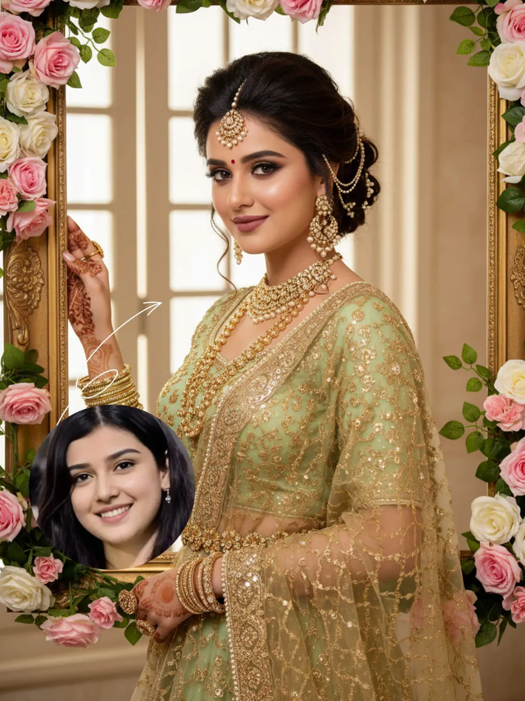 The identity of the uploaded portrait is strictly preserved (retaining facial contours, authentic Indian skin tone, hairstyle and age). This is a bust portrait with a 3:4 aspect ratio, featuring a stunning Indian bride with exquisitely delicate makeup: deep defined eye makeup paired with a matte bean paste red lip, and a red crystal bindi adorned on her forehead. Her hair is styled into a vintage voluminous updo dotted with golden beading, and an ornate maang tikka inlaid with pearls and micro-diamonds sits atop her head. She is dressed in a fresh light-luxury teal Lehenga Choli: the blouse is a slim-fit short-sleeve style fully embellished with intricate golden heavy hand-embroidery and tiny crystal accents, edged with a delicate pearl trim. A golden tulle dupatta is draped over her shoulders and back, emanating a soft inherent luster; a matching golden carved waist chain cinches her waist. Around her neck, she wears layered gold beaded necklaces, with dangling openwork gold earrings at her ears, and more than ten layers of golden bangles and rings adorning her hands. She strikes an elegant pose, lifting one hand to gently brush the edge of a golden photo frame, her eyes looking softly at the camera. The backdrop features a large vintage carved golden photo frame encircled by pink-and-white gradient roses and fresh green vines, set against a soft indoor space where natural light filtering through the window lattice creates a bright and fresh atmosphere. Soft natural lighting is adopted: warm-toned light illuminates the bride’s face and attire, highlighting the luster of the embroidery and the translucency of the tulle dupatta, crafting an overall romantic and fresh ambiance. The style is a light-luxury romantic Indian bridal portrait, boasting ultra-high definition and delicate details, fresh and soft hues, and rich, well-rounded textures that perfectly capture the dreamy and elegant atmosphere.