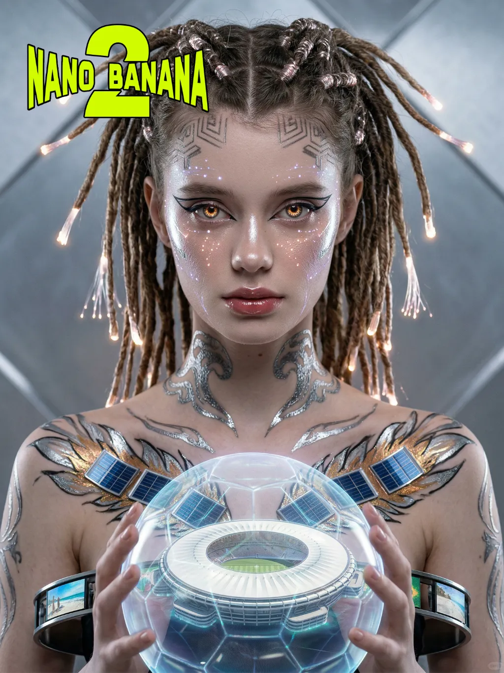 Use the exact same facial features, gender, and age as the uploaded image.Fiber-optic braided dreadlocks, glowing tips, geometric scalp patterns, Copacabana wave conductive tattoos, futuristic sharp eyeliner, fiber-optic cheek light patterns, amber glowing pupils, liquid metal highlighter, thermochromic lip gloss, micro LED star trails on face, liquid metal samba feather body paint with micro solar panels, deconstructive magnetic levitation metal ring skirt with Rio beach LED screens, fiber-optic ankle wraps, front-facing pose, head slightly bowed, steady resolute gaze forward, translucent holographic football with Maracanã Stadium, medium shot, sharp focus on facial details, silver diamond futuristic tech background, cyberpunk lighting, cinematic, hyper-realistic, 8K, high detail, Brazilian futurism, no obvious personal pronouns