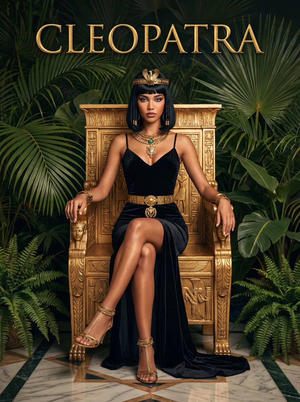 The character in the uploaded picture (unchanged facial features, gender and age).A striking woman embodying the persona of Cleopatra, seated regally on an ornate golden throne. She has a sleek black bob haircut with blunt bangs, a sharp, confident gaze, and a poised, authoritative expression. She wears a form-fitting black velvet spaghetti-strap gown with a high slit, revealing one leg. Her accessories are opulent: a golden pharaoh-style headdress with a central eagle motif, a layered gold necklace culminating in a large, ornate pendant, a wide gold belt with a matching large pendant, gold bracelets on both wrists, and gold ankle bracelets paired with strappy gold sandals. She sits with one leg crossed over the other, one hand resting on the throne's armrest, the other on her lap. The throne is intricately carved with gold accents and topped with golden finials. The setting is a lush, verdant tropical jungle, filled with large, vibrant green palm fronds and broad-leafed ferns that frame the scene. The floor is a polished marble surface with a geometric pattern. Above her, the word "CLEOPATRA" is displayed in an elegant, golden, serif font. The image is rendered in a vintage Hollywood movie poster style, with dramatic, high-contrast lighting that emphasizes the richness of the black velvet and the sheen of the gold. The color palette is rich and saturated, with deep greens, luxurious golds, and stark blacks, creating an opulent, mysterious, and timeless atmosphere. The overall aesthetic is cinematic, detailed, and evocative of ancient Egyptian grandeur.