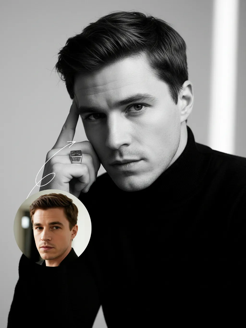 Strict identity verification is carried out using the uploaded avatar (maintaining consistency in facial features, hair, skin tone and age). The composition frames the head and shoulders from the top of the head to the upper chest; the face is angled three-quarters to the left and slightly downward, with the chin gently tucked, eyes almost straight to the camera, a stern and cold expression, and lips firmly closed, featuring a sharp jawline and a straight nose. The short black hair is slightly tousled with a few strands falling onto the forehead, styled to have a subtle sheen to its texture. He is wearing a pure black long-sleeved turtleneck sweater with the collar snugly wrapped around the neck. Set against an off-white interior background, his left hand is raised with the index finger touching the temple, the other fingers curled, and a large, prominent silver signet ring adorns his finger, clearly visible against the black sleeve. Soft studio key light streams in from the upper left (the camera’s left), casting intense highlights on the left side of the face and deep shadows on the right side. The background gradients from grey to white, with a faint vertical gradient light strip on the right side. The entire image is in full black and white with no color, only grayscale tones, boasting extremely stark contrast and exquisitely sharp details. It features a studio lighting style, portrait photography aesthetics, and an avant-garde fashion black-and-white photography style.