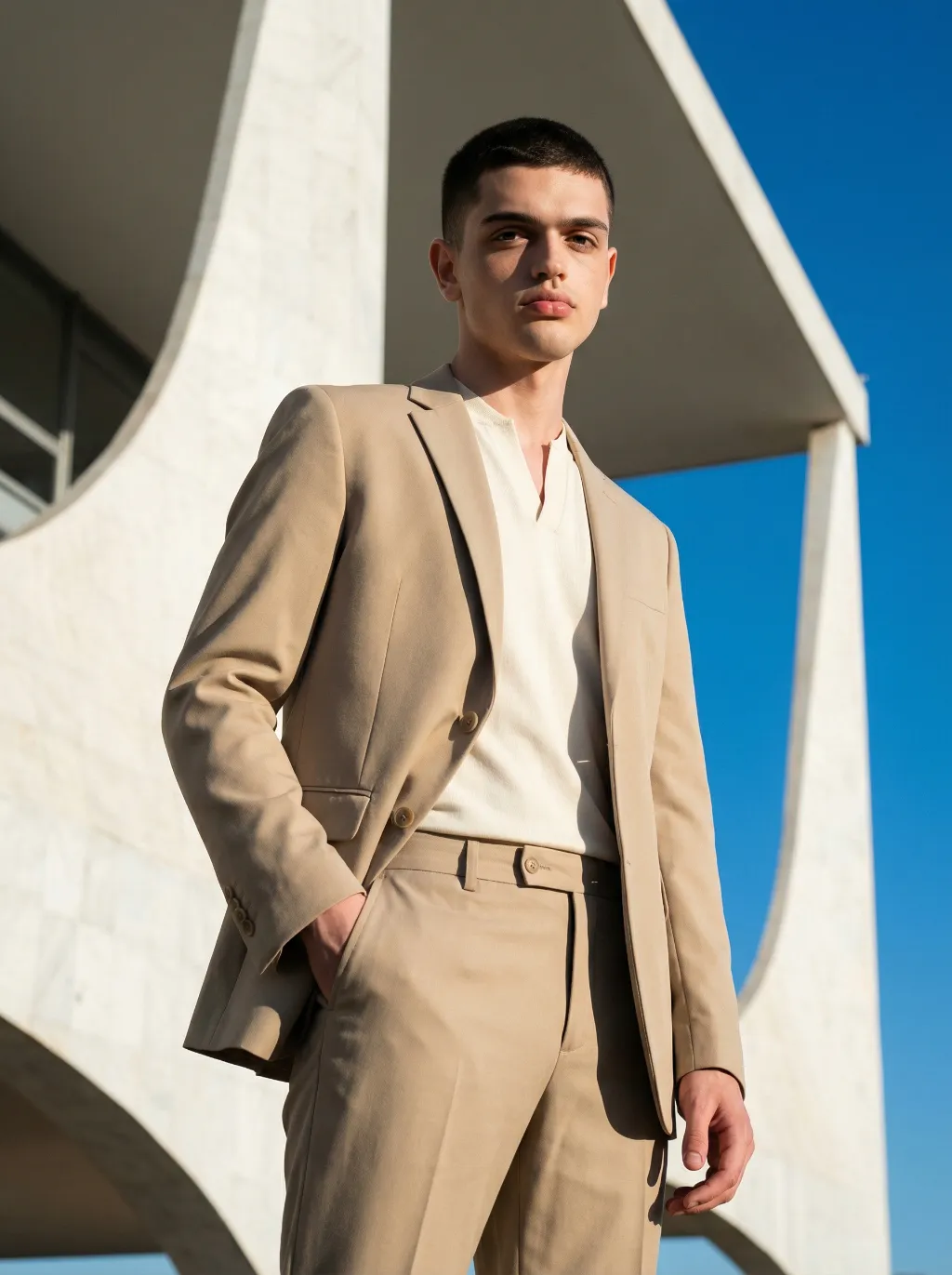 Use the exact same facial features, gender, and age as the character in the uploaded image. Photorealistic modernist fashion portrait, Brasilia architectural aesthetic, Oscar Niemeyer style, rational, restrained, structural beauty. Setting: in front of massive white concrete curved structures, vast empty space, clean geometric lines, extremely clear blue sky, minimalist powerful architectural background. Outfit: structured sand or ivory white suit with sharp silhouette, minimalist collarless inner top or clean high-neck base, neat short haircut, refined facial features, no obvious accessories, pure and minimalist style. Pose & Expression: subject height occupies 9/10 of the frame, clear and detailed facial state — natural relaxed gaze, subtle calm expression, distinct facial contours and skin texture visible; dynamic posture with slight movement: one hand naturally hanging by the side, the other gently resting on the suit pocket, shoulder slightly tilted, body with a relaxed yet upright stance, adding subtle dynamism without losing restraint. Lighting: strong side light with clear rim light, distinct shadows cast on the building surface and the subject’s body, high contrast without loss of details, key light highlighting facial features to ensure clarity. Color tone: high dynamic range, cool white and highly pure blue sky, naturally slightly warm skin tone, sharp image, clear contrast. Composition: low-angle upward shot, 35mm or 50mm lens with mild wide perspective, close camera distance, strong architectural presence and sense of power, sharp focus on the subject’s face and upper body. Style: high detail, realistic skin texture, commercial fashion aesthetic, 8K ultra-realistic, no text or watermarks.