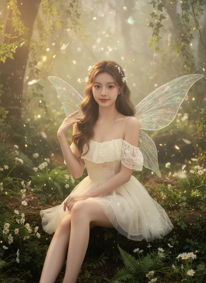 Strictly lock the facial features of the uploaded portrait (completely preserve facial contours, native skin tone, hairstyle and age); forest elf girl with light brown curly hair and white flower hair accessories, clear nude makeup with light pink blush, facing the camera directly with a clear facial expression, lively and gentle eyes, sitting upright with fair and slender legs exposed (naturally straight or slightly bent), one hand resting gently on the leg and the other touching the elf wing; wearing an off-white lace strapless tulle dress with transparent glitter elf wings on the back, full of fairy aura; background is a forest secret realm surrounded by lush green plants, interwoven with ferns, white small flowers and vines, mist filling the forest, warm light filtering through branches to form fine light spots, butterflies and light particles flying in the air; overall forest elf + dreamy fairy atmosphere photo, soft and transparent light, low saturation forest tones, cinematic lighting, motion blur (light spots/butterflies/hair), full of details, 8K ultra-clear, realistic human photography, flawless