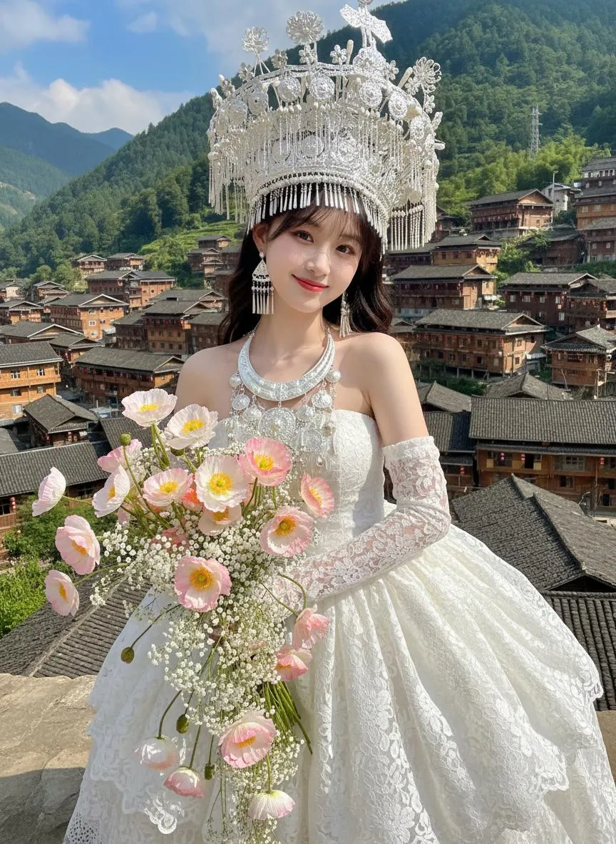Strictly lock the facial features of the uploaded portrait (completely preserve facial contours, native skin tone, hairstyle and age). From a high-angle top-down perspective, a young and sweet East Asian woman tilts her body gently to the right, with a gentle and healing smile and bright, captivating eyes. She wears an ornate and intricate large-horned headdress of Miao silver ornaments, a multi-layered Miao silver necklace, a white lace strapless puffy dress, and long white lace gloves. Her hands hold a large bouquet of mixed pink-white gradient poppies and small white flowers, which falls naturally and extends toward the camera. The background features the cascading wooden stilted buildings of Xijiang Qianhu Miao Village in Guizhou, lush green mountains in the distance, and a fresh cloudy blue sky. Bright natural sunlight illuminates the entire scene, casting distinct soft shadows on the ground and the hem of the dress; warm sunlight creates gentle highlights on the Miao silver ornaments, lace fabric and flower petals, forming a clear light and shadow contrast. High-definition realistic portrait photography, soft and bright natural light, fresh and transparent colors, blending ethnic style with a fairy-tale vibe.