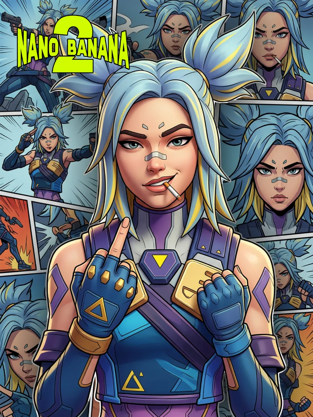 Based on the image of the protagonist in the uploaded picture (while retaining the facial features, gender and age of the character to ensure consistency with the character in the picture), create a 3D stereoscopic image work for the character in "Valorant", perfectly reproducing the artistic style of the game poster. The depiction of this character has 3D volume and structure, but adopts the aesthetic style of 3D game posters: clear thin black outlines, bright flat colors and exquisite 3D rendering, emphasizing the fine 3D rendering effect. The character's hair is light blue with yellow highlights, styled into two high and sharp ponytails. The face presents a confident and rebellious expression, with a cigarette in the mouth, making a middle finger gesture towards the audience, and there are some black projections and thick black strokes around the character, making it stand out from the background. The background is a collage of comic pages (presented in 2D comic style, with thick black strokes, comic design style), each page showing different close-up expressions of the same character (based on the image in the uploaded picture), forming a richly layered and self-referential composition. This character is wearing the iconic tactical clothing, equipped with blue, purple and gold decorations, including shoulder pads, chest decorations with yellow triangles and blue gloves. The lighting uses a movie-level 3D rendering effect, with high contrast, to highlight the character's attitude and this stylized 3D shape. The overall atmosphere is avant-garde, confident and visually impactful, perfectly combining the depth of 3D stereoscopic rendering with the style of comic, Maya, Blender and C4D OC renderers.