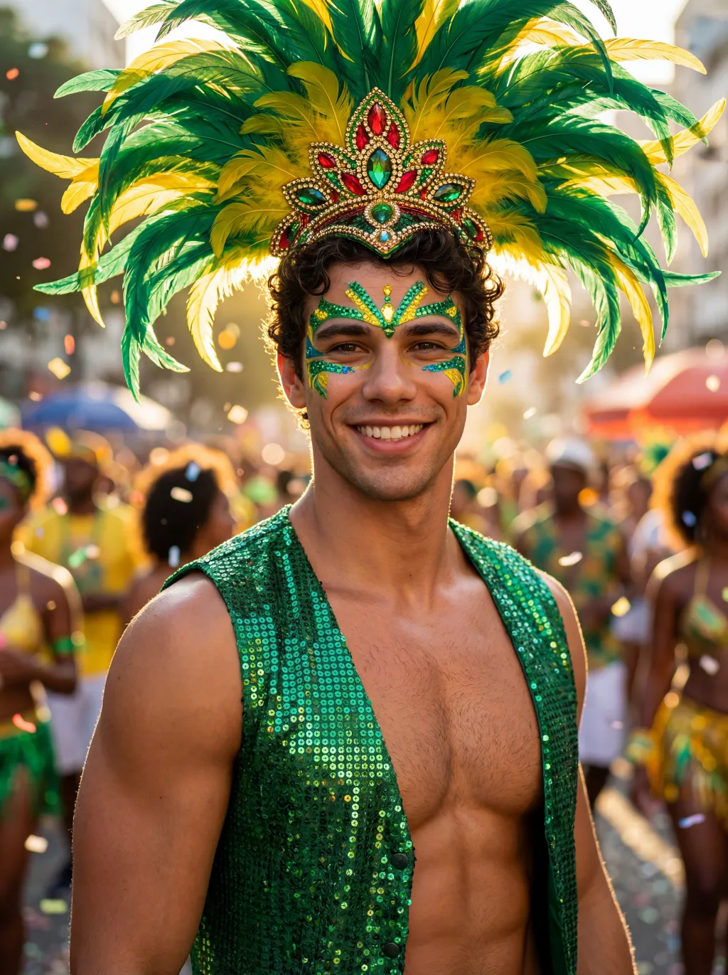 Use the exact same facial features, gender, age, and natural skin tone as the character in the uploaded image. Do not alter, lighten, darken, or modify the original complexion in any way. Maintain his authentic skin color exactly as in the reference image. curly textured hair, radiant natural skin, and a confident, magnetic smile, standing proudly at Rio Carnival. wears an elaborate headdress made of large green and yellow feathers, with an ornate centerpiece featuring red, green, and gold jewel details. His face is painted with bold, symmetrical Carnival patterns in emerald green and vibrant yellow, with striking blue accents around the eyes, enhancing gaze. dressed in a shimmering emerald-green sequined vest that catches the light dramatically, partially open to reveal his athletic chest. Natural body highlights emphasize physique realistically without altering skin tone. Lighting: strong cinematic light contrast — warm golden sunlight illuminating one side of his face and torso, creating sculpted highlights, while preserving accurate skin color and natural undertones. Soft shadow adds depth and dimension without washing out or overexposing the complexion. Subtle rim lighting around the feathers enhances separation from the background. High dynamic range with true-to-life skin rendering. Background: a lively Rio street during Carnival, filled with a cheering crowd in colorful festive clothing. Confetti floats in the air. The crowd is slightly blurred (shallow depth of field), making the subject stand out sharply. Mood: vibrant, joyful, triumphant, powerful, charismatic. Style: high-resolution cinematic photography, poster-quality, ultra-sharp focus on subject, shallow depth of field, 85mm lens, HDR, rich saturated colors, dramatic contrast, professional fashion-editorial lighting, realistic skin texture, natural complexion fidelity, magazine cover composition.