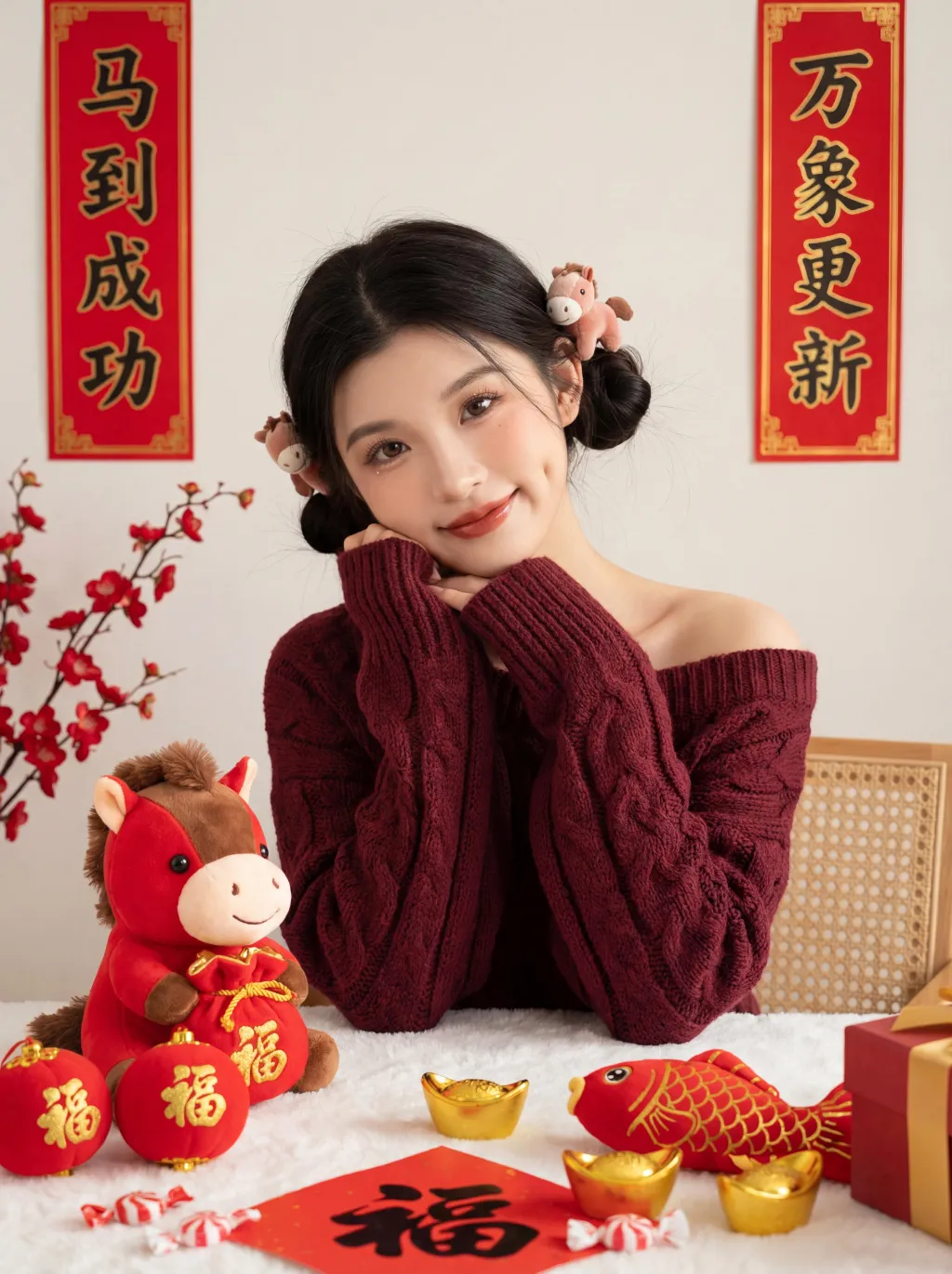 zero deviation uploaded facial features (contours, eyes, lips, youthful look), young East Asian sweet girl, half-body sitting, elbows on table, body slightly right-tilted, head gently tilted, sweet smile with shallow dimples, direct eye contact, natural lively posture, two low rounded space buns, playful vibe, each bun adorned with small pony plush hair accessory, born-perfect base makeup, brownish-black wild eyebrows, earth-tone eye makeup, teardrop pearlescent under-eye highlight, sunflower curled long lashes, peach blush, mirror-finish reddish-brown lip glaze, cupid's bow highlighter, clean light texture, burgundy chunky cable-knit off-shoulder sweater, loose slouchy, wide cuffs, waist-length, white fluffy tablecloth, red plush pony (brown mane, red pouch with golden patterns) on table, red balls printed with golden 福 characters, golden ingots, red fish plush toy with golden scales, red paper with handwritten 福 characters, red-white candies, red-gold gift box corner, traditional Chinese New Year scene, off-white matte wall, red vertical couplets with golden borders, left couplet: 马到成功, right couplet: 万象更新, positions fixed, no character modification allowed, red plum blossom branch, light brown rattan chair edge, clean background, strong festive vibe, soft warm side-front natural light, no harsh shadows, texture highlighting, red-gold-off-white color palette, festive warm healing, Year of the Horse charm, 8K ultra HD, photorealistic, ultra-detailed, film texture, noise-free, clear transparent 负向提示词: Do not modify the content of the couplet characters, do not make typos, do not add or delete any strokes, do not use cursive script, do not use blurry fonts, do not distort the characters, do not add extra text, do not change the positions of the couplets, do not alter any characters in "马到成功" and "万象更新", do not cartoonize the characters, and do not artistically deform the characters.