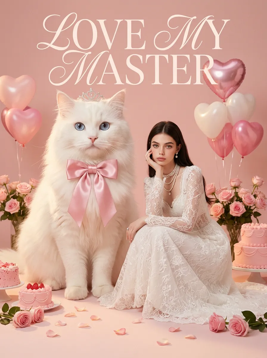 Surreal photography art: In the uploaded picture, the pet (with its features remaining the same, but its size transformed into a huge one with fluffy fur, occupying the left side of the picture and wearing cute accessories), and a person in the uploaded picture (with unchanged facial features, gender, and age) wearing an exquisite white high-end custom dress (wearing delicate accessories), places their chin on their hand and sits slightly on the ground beside the aforementioned pet, with the proportion of the pet and the person in the picture being 1 to 1; the color scheme is pink, with a natural realistic style, a photography studio photography style, the background is a simple pale pink clean photography studio background surface, surrounded by pink cakes and roses, with princess-style, Valentine's Day elements such as heart-shaped decorative balloons, a realistic pet photography style. High-key, soft, bright light, soft diffused shadows, warm low saturation tones (mutton white, pink, warm orange), creating a warm, intimate romantic Valentine's Day atmosphere between the pet and the person, fashionable avant-garde photography art, realistic film-level realistic effect, with a large title artistic design font: LOVE MY MASTER.