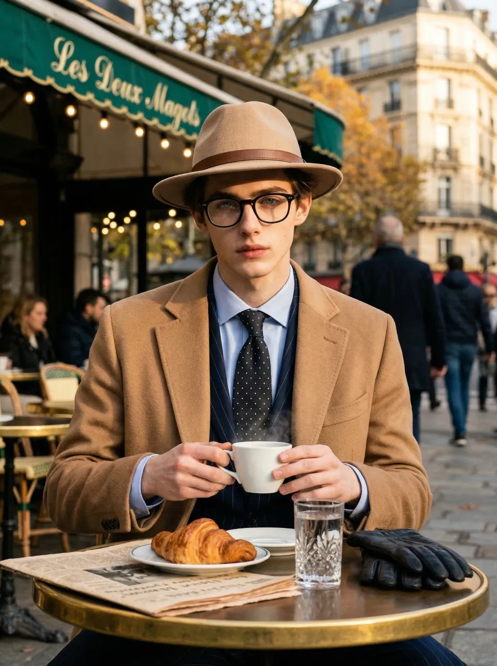 Preserve the character's facial features and hairstyle exactly as in the reference image. He wears sophisticated black-rimmed glasses, a timeless beige fedora with a refined brown leather band, a tailored camel cashmere overcoat, a dark navy subtle pinstripe suit, a crisp light blue dress shirt, a dark silk polka-dot tie, and black leather gloves resting on the table. He is seated at an outdoor table at the iconic Les Deux Magots café in Paris, gently holding a white ceramic coffee cup with both hands, delicate steam curling upward. Table details: round polished brass tabletop, a crystal glass of still water, a half-eaten buttery croissant on a porcelain plate, a vintage French newspaper, and elegant black leather gloves. Background: the signature green awning of Les Deux Magots, warm vintage string lights, softly blurred Parisian pedestrians, rich autumnal foliage, classic Haussmannian architecture in gentle bokeh. Lighting & Style: strong golden hour light and shadow contrast, dramatic chiaroscuro lighting on the face, partial sunlight gilding one side of his face while the other remains in soft shadow, high contrast key light, warm muted color grading, ultra-shallow depth of field, cinematic film photography, quiet luxury & old money aesthetic, hyper-realistic textures, intricate details, 8K, professional high-end fashion & travel editorial photography, shot on Sony A7R IV with 85mm f/1.4 lens, film grain, elegant composition, sophisticated atmosphere.