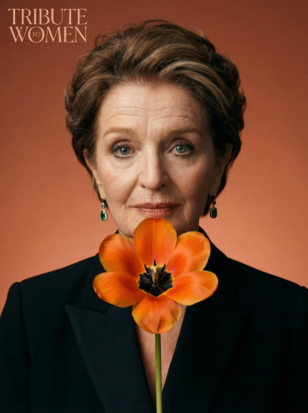 Use the exact same facial features, gender, and age as the uploaded image. This is a studio portrait, medium shot framing the subject from the chest up. A vibrant orange tulip is held in front of the face, with the flower being approximately the same size as the face. The subject is wearing a sleek black blazer and delicate, elegant emerald drop earrings. The background is a smooth, warm terracotta gradient, creating a minimalist and sophisticated atmosphere. Soft, directional studio lighting accentuates the texture of the skin and the luster of the tulip petals, with the deep black center of the flower forming a striking contrast against the surrounding area. Side lighting casts natural shadows on the face, adding dimensionality. The composition is front-facing, focusing on the calm and dignified expression, as well as the strong color contrast between the flower and the dark attire. The image features cinematic color grading and rich, ultra-realistic details. The text “TRIBUTE TO WOMEN” is artistically integrated into the upper left corner as stylized art font, harmonizing with the portrait’s elegant tone without overwhelming the visual.