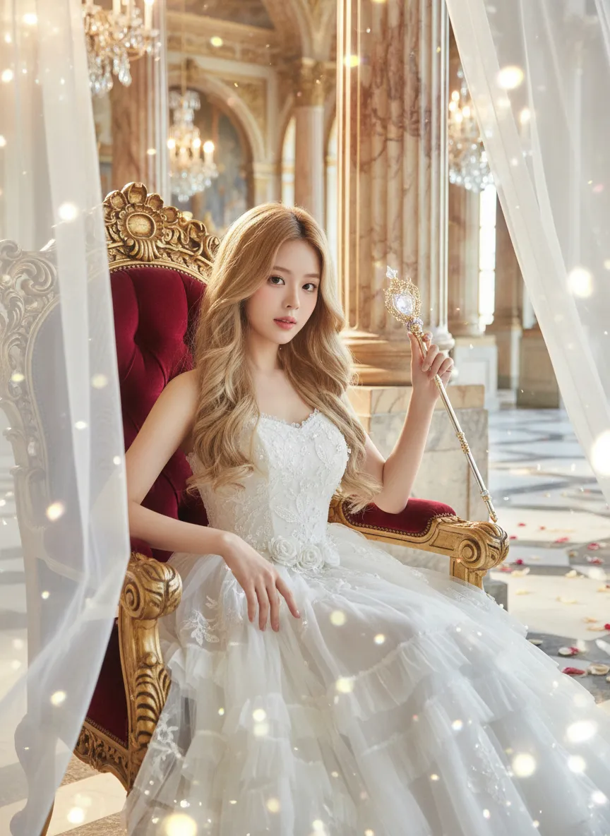 Strictly lock the facial features of the uploaded portrait (completely preserve facial contours, native skin tone, hairstyle and age); medium shot (bust-up), young girl with light golden long curly hair, Korean sweet style looks, delicate facial features with clear nude makeup and light pink blush, proud and elegant princess demeanor, sitting gracefully on an ornate throne with one hand resting lightly on the armrest and the other gently holding a delicate scepter/flower, head tilted slightly with a haughty yet gentle gaze; wearing a white strapless tulle dress with multi-layered flowing tulle skirt, delicate white lace embroidery and subtle pearl decorations, exuding a noble and dreamy fairy-tale princess aura; background is a magnificent and dreamy royal palace hall with towering marble columns, intricate golden carvings, soft warm chandelier light casting a glowing halo around her, sheer white tulle curtains fluttering gently, scattered rose petals on the marble floor, distant palace arches blurred into a soft bokeh effect, air filled with sparkling light particles; overall **dreamy fairy-tale + French retro + royal palace princess atmosphere photo, soft and ethereal ambient light, warm romantic film texture, high saturation dreamy tones, cinematic lighting with glowing rim light, motion blur (light particles/curtains), rich texture details, 8K ultra-clear, realistic human photography, flawless, full of magical and noble royal princess charm