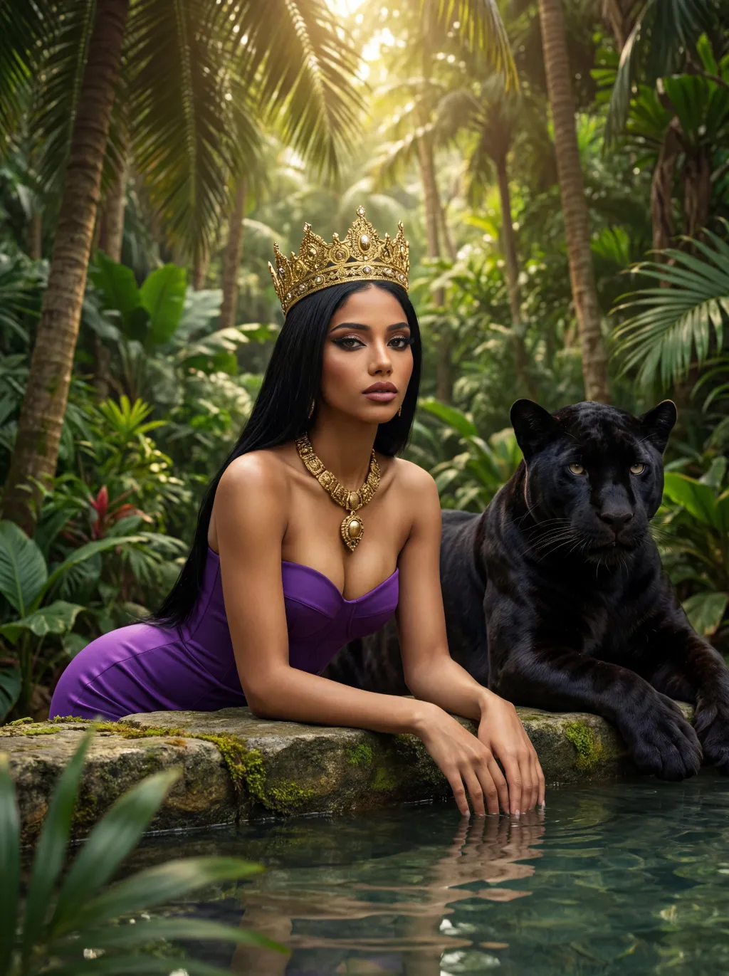The character in the uploaded picture (unchanged facial features, gender and age). A striking woman with long, sleek black straight hair, embodying a powerful jungle queen, captured in a hyper-realistic, cinematic portrait. She has a regal, intense gaze, and bold, dramatic makeup. She wears a form-fitting, strapless purple bustier dress that accentuates her curvy, graceful figure. She is adorned with a large, imposing golden crown on her head, and a thick, ornate golden necklace with a prominent pendant around her neck. She leans forward, resting her forearms on a weathered stone ledge at the edge of a shallow pool, her hands submerged in the clear, still water. A majestic black panther with sleek, glossy black fur rests calmly beside her, its body partially visible behind her, exuding a sense of primal power and quiet companionship. The setting is a lush, dense tropical jungle. Towering palm trees and broad-leafed plants fill the background, their vibrant green leaves creating a dense, verdant canopy. Soft, dappled sunlight filters through the foliage, casting a warm, golden glow on the scene and creating a serene, otherworldly atmosphere. The image is rendered in a hyper-realistic, cinematic style, with sharp focus on the subject, soft bokeh on the background, and dramatic, natural lighting that accentuates the rich purple of her dress, the glossy black of the panther's fur, and the intricate details of the golden crown and necklace. The color palette is rich and vibrant, featuring deep purples, glossy blacks, radiant golds, and lush greens, creating a timeless, powerful, and awe-inspiring atmosphere. The overall aesthetic is detailed, lifelike, and reminiscent of a scene from a grand fantasy epic, blending primal power with regal elegance