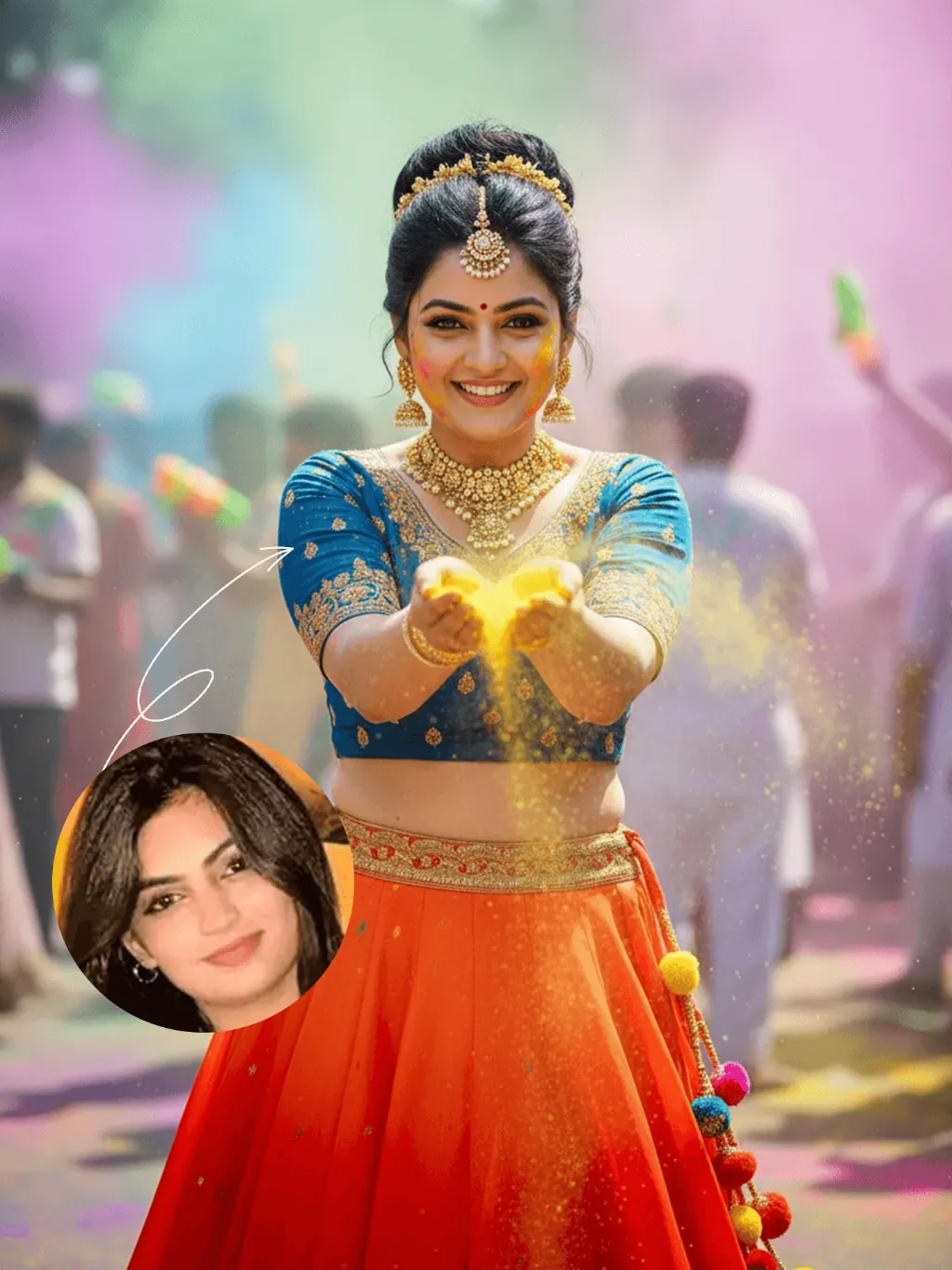 The identity of the uploaded portrait is strictly preserved (retaining facial contours, authentic Indian skin tone, hairstyle and age), as is the original natural look of the Indian woman in the reference image. She has a delicate and fair face with a vermilion red bindi on her forehead, her jet-black hair styled into a high bun adorned with golden floral hair ornaments, and she wears exquisite gold earrings and a gold necklace. She is dressed in a vibrant traditional lehenga choli set: the blouse is a peacock blue embroidered cropped corset with golden patterns embellishing the cuffs and neckline; the skirt is a flared maxi with an orange-to-red gradient, paired with a gilded embroidered waistband. The skirt is dotted with colorful pom-pom trimmings, echoing the hues of Holi. Standing front-on, she holds a handful of bright yellow gulal in both hands and tosses it forward, with a brilliant smile on her face, bright eyes brimming with joy, and her body leaning slightly forward with the movement, exuding a vivid sense of dynamism. The scene is a lively Holi street celebration, where the surrounding crowd interacts with water guns and gulal, and colorful powder splatters in the air, forming a vivid, highly saturated multicolored backdrop. Lighting effect: Bright midday natural light renders the colors extremely saturated and vivid. The figure is enveloped in a halo of colored powder, with fine powder particles clearly visible on the edges of her hair and garments, capturing the authentic dynamic texture of a candid shot. Boasting 8K ultra-high definition resolution and commercial-grade portrait quality, the image features rich, bright and vivid colors and abundant fine details, highlighting the vibrant and joyful atmosphere of the festival.