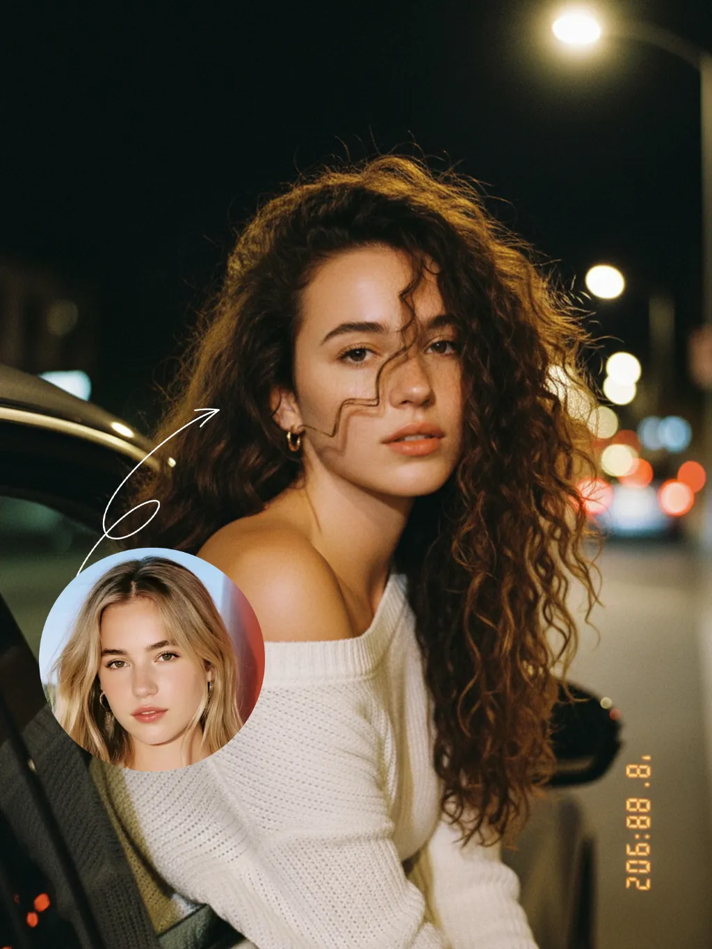 The uploaded figure (with unchanged facial features) is lit by a high-intensity flash fired directly at them, creating stark contrast between light and shadow, prominent highlights on the figure’s face, and a dark-toned background with blurred bokeh light spots. This is a medium close-up portrait: the figure leans out of a car window with their upper body, in an off-the-shoulder pose, their long dark brown curly hair tousled and flowing in the wind. They wear a loose white off-the-shoulder knit sweater, gaze straight at the camera with a lazy and cool expression. Shot from an eye-level perspective, the background features a nighttime urban street with slightly blurred traffic flow, warm yellow street lamp glows and red taillight bokeh, and a shallow depth of field with bokeh effects. The overall mood blends a warm color tone with a cool atmosphere, complemented by film texture and film grain, plus ultra-high-definition details. An orange vertical digital date watermark (2026:00:00) is added to the bottom right corner.