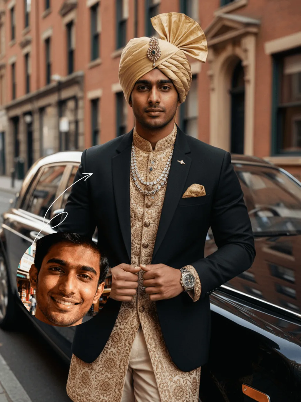 Strictly lock the uploaded portrait's identity (preserve facial contours, switch to native Indian skin tone, retain hairstyle texture and age). Close-up to mid-full body shot of a handsome young South Asian (Indian) man with a **broad, muscular, imposing physique**, confident intense "tycoon" gaze, and **ultra-clear, high-resolution facial details**. He wears a fusion luxury outfit: tailored black blazer over intricately hand-embroidered gold Indian-motif sherwani, cream churidar trousers, lavish gold turban with gemstone brooch, layered gemstone statement necklaces, gold pocket square, and high-end watch. Leaning against a black Rolls-Royce Phantom on a sophisticated city street with historic brick buildings. High-end fashion photography, cinematic lighting, film-like texture, warm black/gold/cream palette, retro-modern fusion aesthetic, powerful sophisticated vibe
