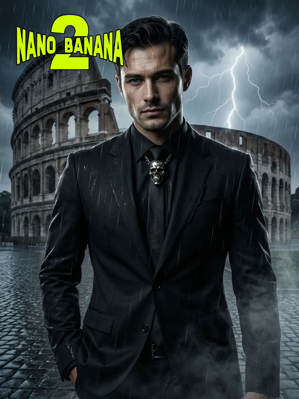 Medium-close-up shot (showing the upper body of the protagonist, shot from above the thighs, with the main character accounting for 70% of the overall picture): Facial features, gender and age are exactly the same as the uploaded picture. The angular facial contour, dark and messy hair, deep and melancholic eyes, one hand in the pocket, confident posture. Wearing a black avant-garde custom suit with deconstructed details, a white shirt, a black tie, and a prominent metal skull brooch at the neckline. Background: The rainy night of Rome, the soaked Roman Colosseum, wet pebbled roads, a stormy sky accompanied by lightning, foggy rain and dark smoke swirling around. Strong contrast of light and dark, dramatic side light, cinematic edge light, high contrast, gloomy and terrifying atmosphere. Avant-garde fashion photography, edited fashion shooting, dark and cool aesthetic, hyper-realism, 8K, ultra-fine, sharp focus, cinematic color grading with dramatic color grading, desaturated tones, dark and rough tones, some raindrops on the character's face, hyper-realistic, fashion avant-garde photography