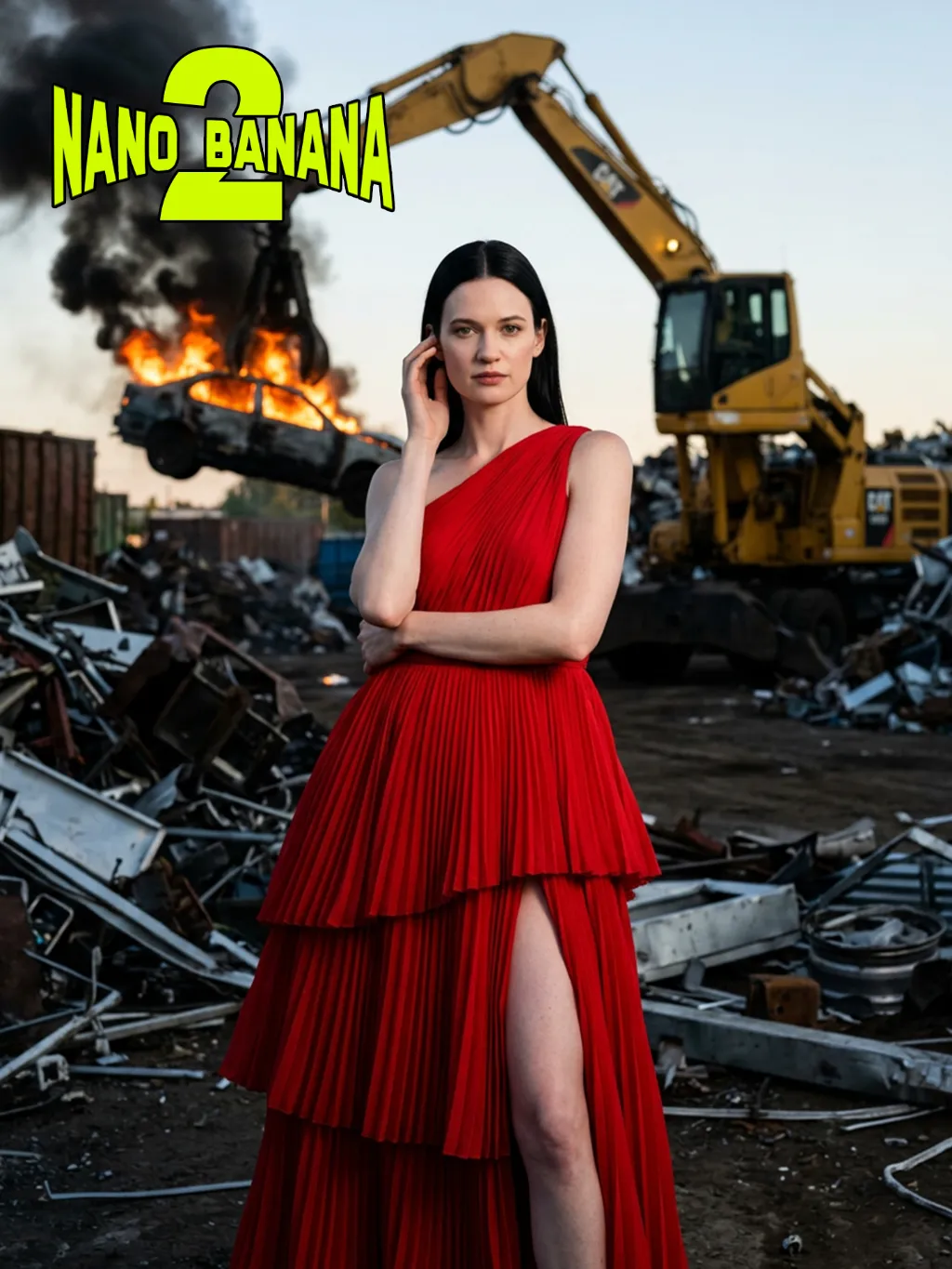 Panoramic shot: The person in the uploaded picture (with unchanged facial features, age and gender) has a refined makeup style. She stands in a junk recycling station covered with distorted metal fragments, wearing a red high-cut, layered, high-end tailored pleated evening gown. Her black straight hair is neatly and smoothly styled. The makeup is clean and transparent, exuding a cold and elegant atmosphere; the posture is elegant: one hand gently rests on the ear, the other arm crossed over the waist, the body slightly tilting towards the camera, the expression is cold and sharp, giving a sense of detachment. In the background, a yellow excavator lifts a burning car, thick smoke billowing upwards. The shooting uses a professional full-frame camera, a 135mm telephoto lens, horizontal perspective, side backlighting at dusk, a strong contrast between warm and cool light, high contrast, rich colors, a fashionable editing style, surreal industrial aesthetics, cinematic visual tension, ultra-fine and realistic effects, avant-garde fashion photography, cinematic realistic effects. The top-level strong contrast lighting effect (side lighting, the edges of the person's face are illuminated).