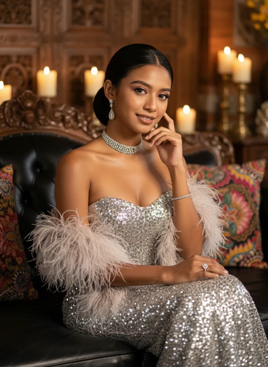 Strictly lock the facial features of the uploaded portrait (preserve facial contours, native Indonesian skin tone, hairstyle and age). photorealistic 3:4 half-body portrait of an elegant 25-year-old Indonesian woman with delicate facial features, soft glamorous makeup, and sleek dark hair styled in a half-updo, wearing a silver sequined strapless gown with feathered shawl, adorned with a diamond choker, long diamond drop earrings, diamond rings and bracelet. She sits gracefully on a black leather sofa with one hand gently touching her cheek, set in a luxurious vintage interior with Balinese wooden carvings, batik wax-print fabric accents, warm golden ambient lighting, candlelight with soft bokeh, subtle Indonesian cultural details, ultra-detailed sequins and feather textures, cinematic texture, sophisticated Balinese luxury ambiance