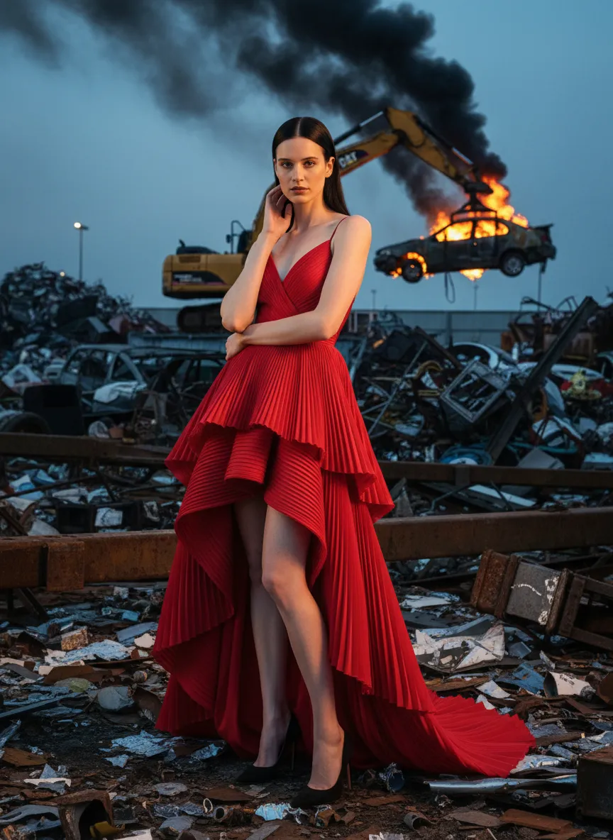 The person in the uploaded picture (with unchanged facial features, age and gender) has a refined makeup style. She stands in a junk recycling station covered with distorted metal fragments, wearing a red high-cut and clearly layered high-end tailored pleated evening dress. Her black straight hair is neatly and smoothly styled. The makeup is clean and transparent, exuding a cold and elegant atmosphere; the posture is elegant: one hand is gently placed on the ear, the other arm is crossed over the waist, the body is slightly tilted towards the camera, the expression is cold and sharp, giving a sense of detachment. In the background, a yellow excavator lifts a burning car, with thick smoke billowing up. The shooting uses a professional full-frame camera, an 85mm medium telephoto lens, horizontal perspective, side backlighting at dusk, a strong contrast between warm and cool light, high contrast, rich colors, a fashionable editing style, surreal industrial aesthetics, cinematic visual tension, ultra-fine and realistic effects, avant-garde fashion photography, cinematic realistic effects, top-level strong contrast lighting effects (side backlighting, the facial edges of the person are illuminated).