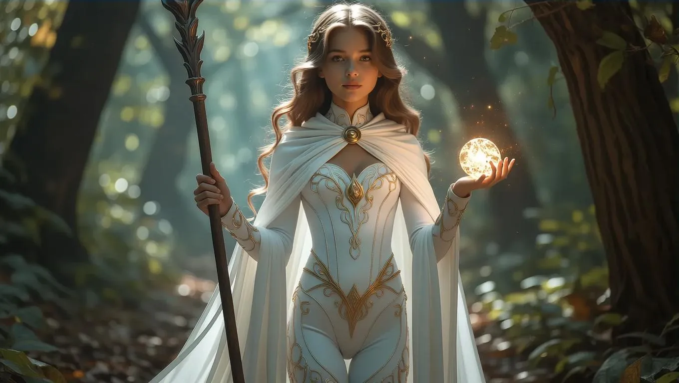 Create a lifelike AI-generated image of a mystical sorceress in a white gold-patterned bodysuit and cloak, wielding a glowing staff. Transform text prompts into vivid fantasy visuals with Vivago.ai's photo-realistic AI tools for enchanting character designs and magical effects.