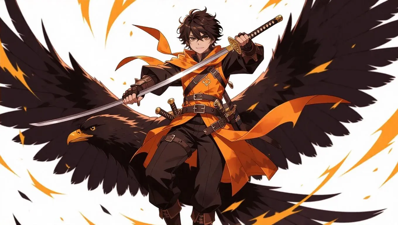 Create a striking 2D anime male character with autumn-themed Robin Hood attire, wielding a golden lightning katana, riding a thunderbird. Perfect AI-generated anime art for dynamic scenes, vivid character design, and fantasy storytelling using creative AI tools.