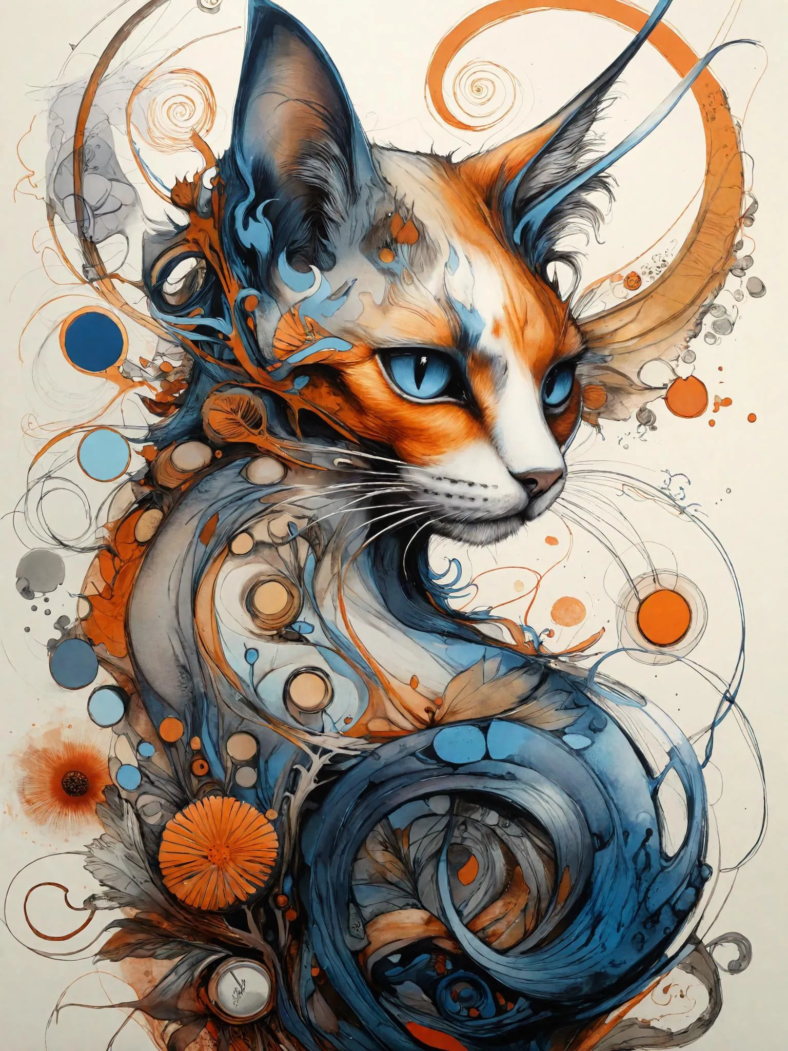 Generate a mystical AI ink sketch of a surreal cat with triadic colors, swirling ink lines, and hyper-detailed 8k resolution. Inspired by Carne Griffiths and Alphonse Mucha, this dreamlike forest scene blends decorative surrealism, luminous volumetric lighting, and fluid alcohol ink textures for a non-realistic, concept-art aesthetic. Perfect for pop-art illustrations or Unreal Engine 7-inspired digital matte paintings.