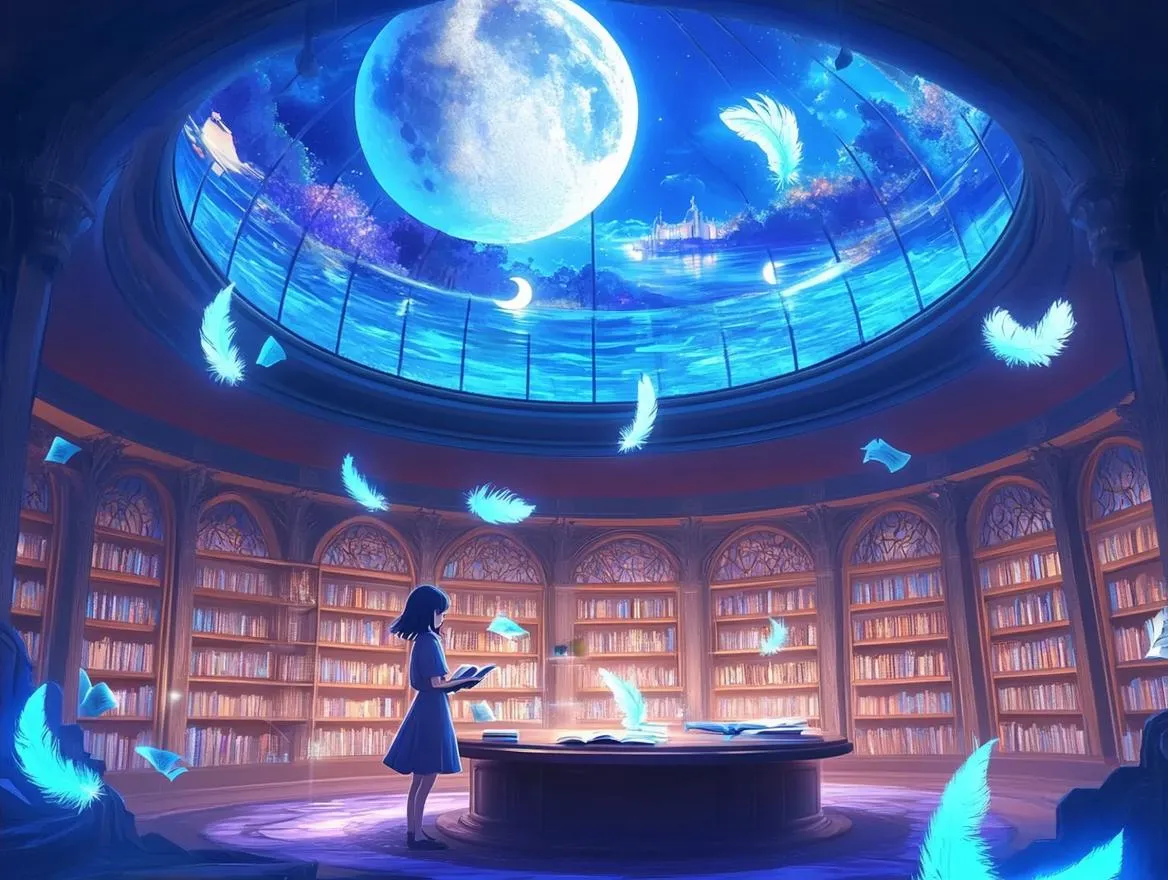 Step into a floating dome-shaped library where glowing feather lanterns illuminate scenes. A girl explores amidst hovering books under a stained-glass ceiling of moons and rivers. AI image generator crafts this ethereal anime scene with soft-focus effects and a dreamy blue-purple palette. Create magical AI art with VivaGo's fantasy tools.