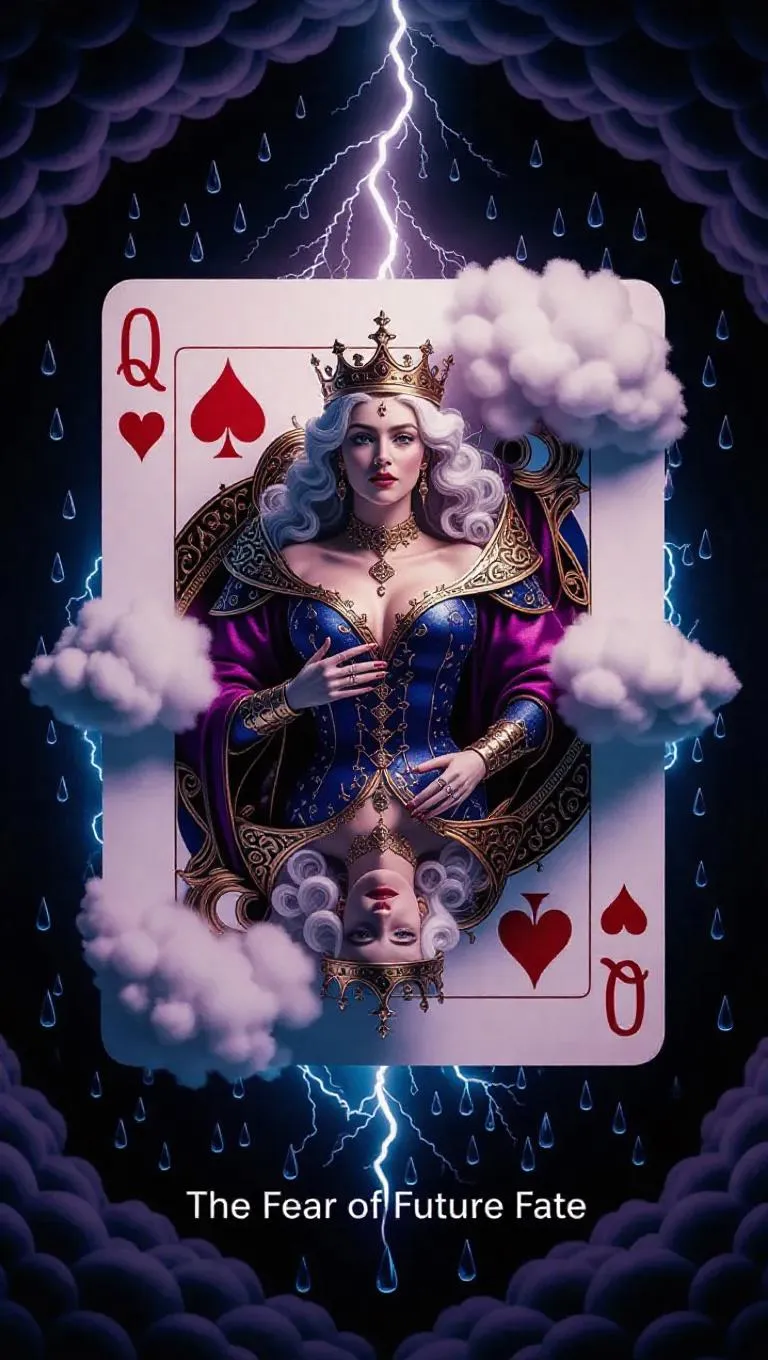 A majestic fantasy electric lightning storm creating queen, adorned upon a queen card, surrounded by ethereal clouds and shimmering tears transforming into raindrops, 3D dimensional game playing card, intricate details, glowing aura, royal regalia, mystical realm backdrop, heavens, card labeled "The Fear of Future Fate"