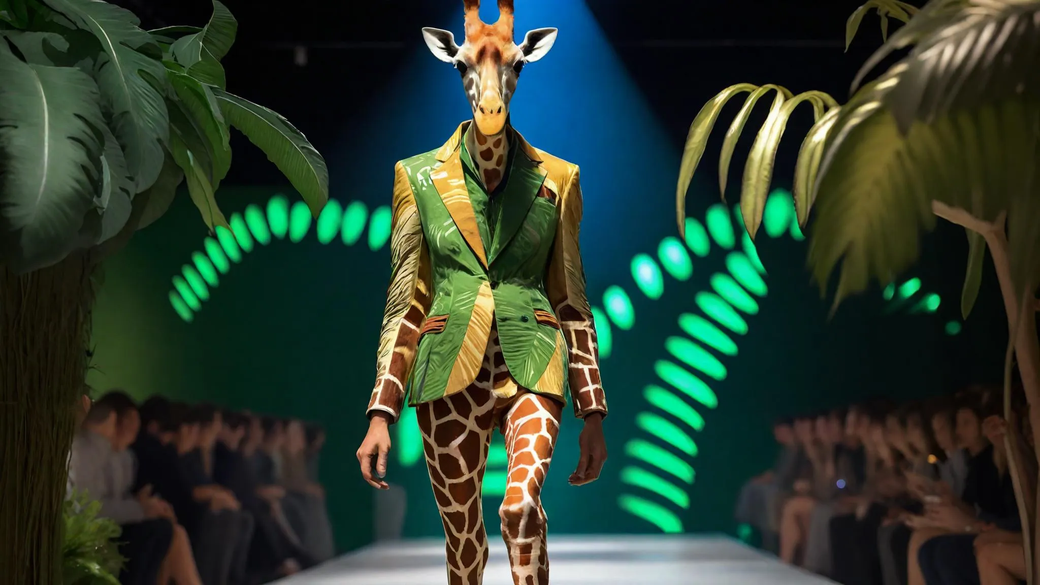 Transform your vision into AI art with this exotic giraffe in a leaf-inspired suit, strutting a nature-themed runway. Detailed hooves, vibrant lighting, and cheering crowds captured in professional-grade AI-generated visuals. Explore creative AI effects for wildlife fashion and dynamic runway photography. Elevate your projects with Vivago.ai’s cutting-edge tools.