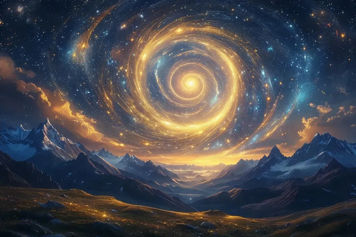Generate a surreal night sky scene with AI: cosmic vortex swirls above mountain silhouettes, vibrant golden spirals and ethereal light trails create a mystical portal. Experience magical realism in 8K resolution, featuring starry celestial gateways, intricate fantasy landscapes, and cinematic lighting for professional digital art. Transform imagination into vivid cosmic dreamscapes with AI-powered precision.
