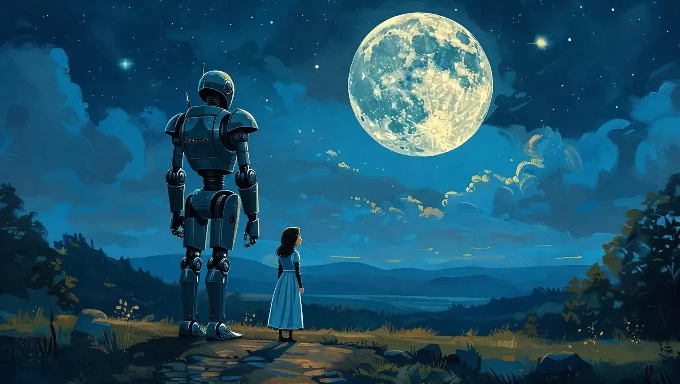 Generate AI-powered medieval fantasy art with VivaGo.ai. Create striking visuals of a half-man half-robot cyborg and mystical small lady under a luminous moonlit sky. Transform text prompts into professional-grade images/videos using advanced AI effects for captivating storytelling and surreal nightscapes.