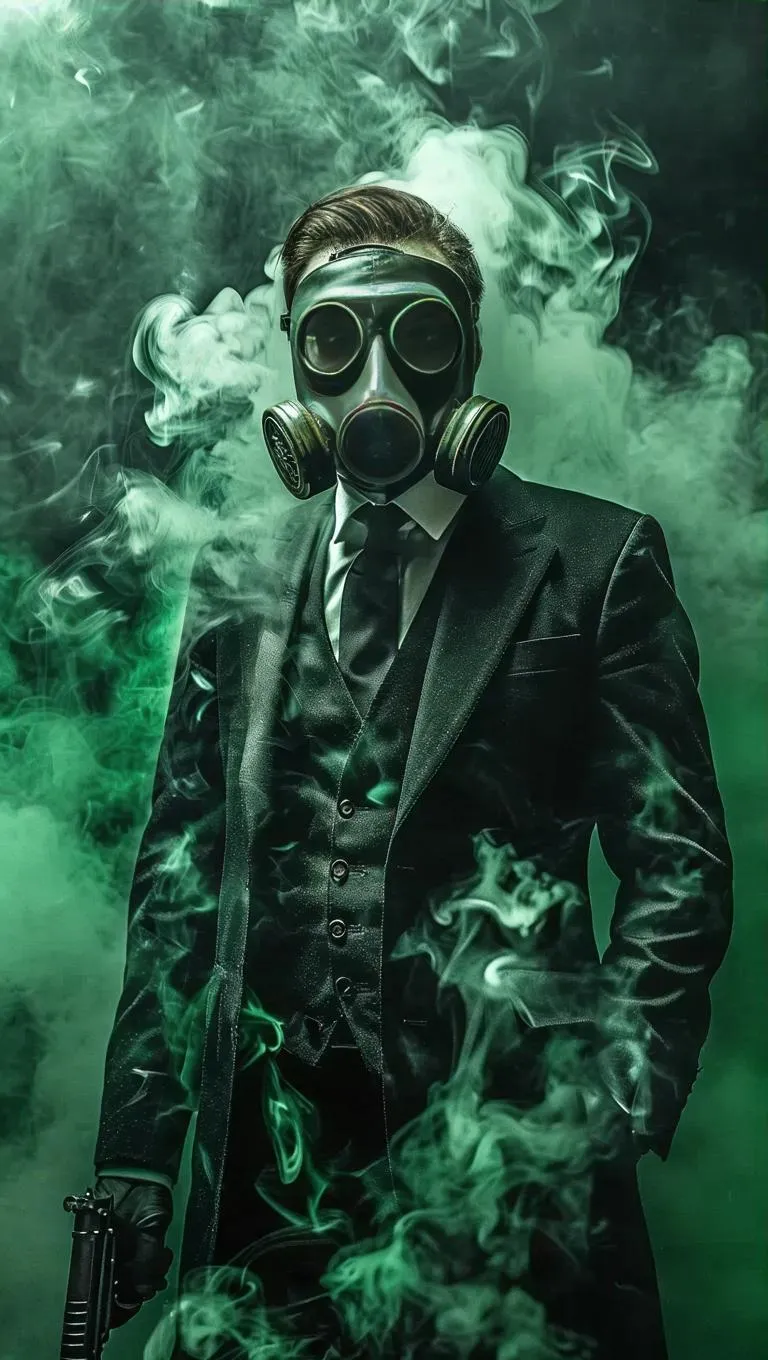 Generate a striking AI image of a gas-masked man in black attire holding an MP, enveloped in eerie green mist. vivago.ai's Cold Light Effect delivers 16k ultra-realistic visuals for professional art, high-resolution imagery, and dramatic AI-powered scene creation. Perfect for dystopian themes and cinematic AI effects.