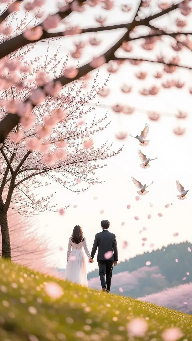 Capture a serene scene of a couple's romantic stroll down a cherry blossom-covered hill, holding hands amidst floating sakura petals. Gentle swaying trees, soaring doves, and soft sunlight create a whimsical, love-filled moment. Craft this dreamy AI-generated visual with vivid details and ethereal effects. Perfect for storytelling, art, or sharing magical AI creations. Transform your vision into stunning visuals.