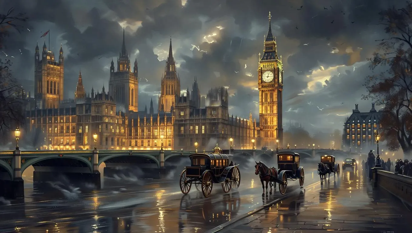 Step into a shadowy Victorian-era London with AI-generated visuals blending Gilded Age opulence and mysterious nocturnal ambiance. Create atmospheric scenes of gaslit streets, ornate architecture, and fog-draped mysteries using cutting-edge AI art tools for dark historical fantasy imagery.