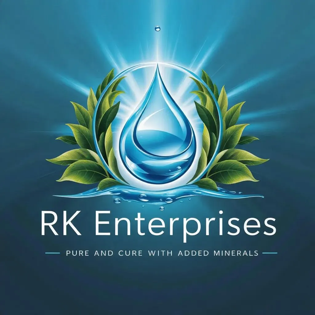 Create a professional, eco-friendly logo for RK Enterprises' water plants with a vibrant water droplet, lush greenery, and calming blue-green hues. Modern fonts highlight "PURE and CURE with ADDED MINERALS," conveying purity, health, and natural freshness. AI-generated design for a clean, nature-inspired brand identity.