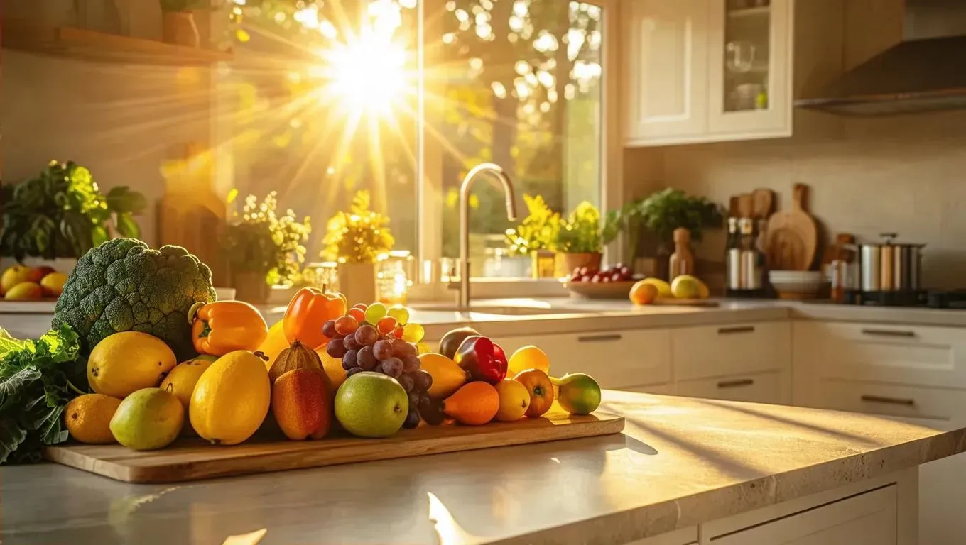 Create a vibrant AI-generated kitchen scene: sunlit counters with fresh fruits, golden rays casting warmth, gleaming appliances. Ideal for culinary visuals, this AI effect combines freshness, abundance, and inviting ambiance for professional-grade creative projects using vivago.ai's image generation tools.