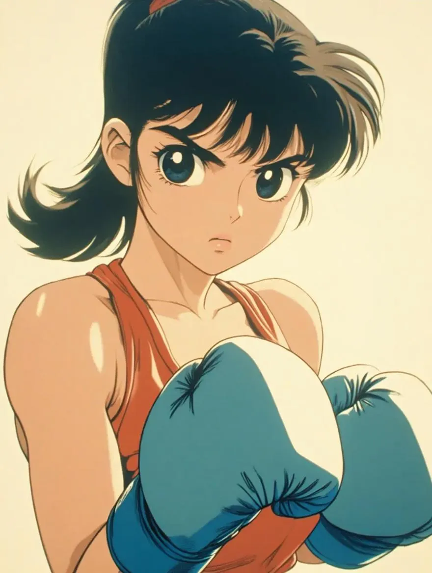 Generate 1980s anime-style AI art with vivago.ai. Create a nostalgic boxing girl with a ponytail, hand wraps, and expressive eyes in retro Japanese manga aesthetics. Perfect for vintage anime lovers, our AI transforms prompts into detailed, soft-edged medium shots, blending clear visuals and authentic 80s charm for professional-grade, nostalgic digital art.