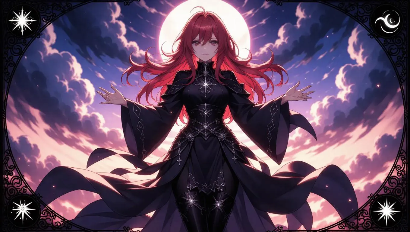 A serene anime-style female witch, adorned in flowing gray robes with silver moons, stands in a powerful pose. Her fiery red hair sparkles with energy, and her dark purple eyes convey knowledge. The background features a stormy night sky with swirling clouds. The scene is framed by an ornate black border with mystical symbols and a shimmering effect.