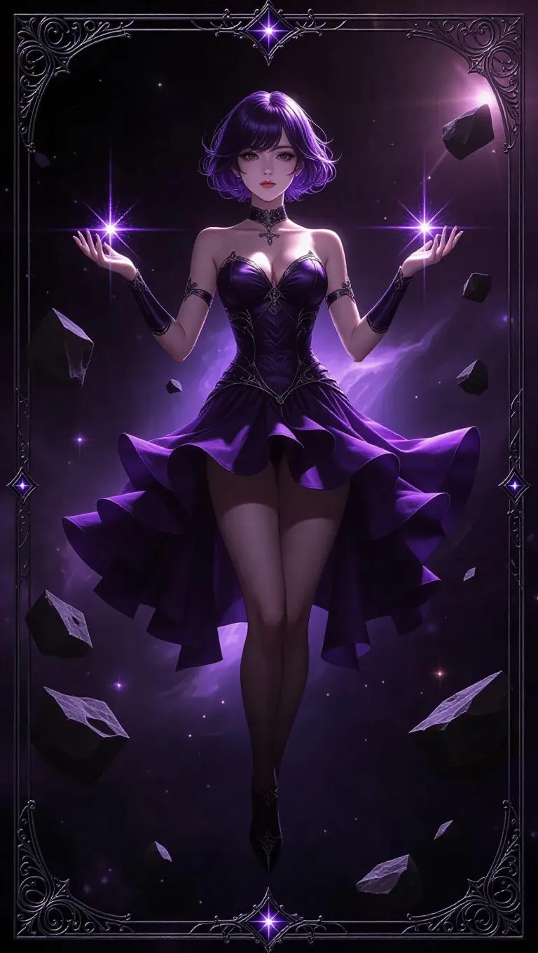 A celestial sorceress floats in space, her short purple hair blending seamlessly with the cosmos. She wears a dress woven from dark matter, casting radiant star spells from her fingertips. The background features sharp asteroids, while the card is framed with a silver border adorned with soft glows and reflective textures. Soft, neutral light illuminates her from above, creating a gentle contrast with the dark, star-studded backdrop. The style is whimsical and dreamy, blending realism with magical elements.