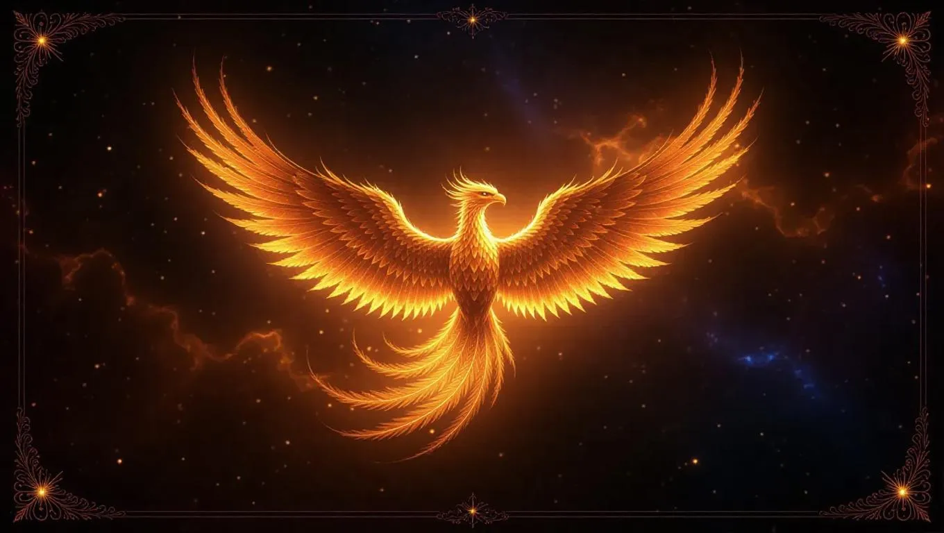 A celestial phoenix rises from stardust, its wings ablaze with nebula flames. Supernovas and swirling stars fill the card background, while the frame sparkles with mellow galaxy colors and aurora effects, adorned with radiant runes. Soft, bright light illuminates the phoenix, casting a glow that highlights the intricate details of its wings. The style is dazzling and ethereal, blending realism with cosmic elements.
